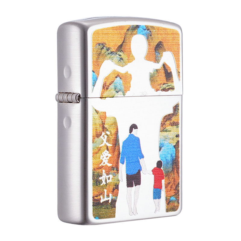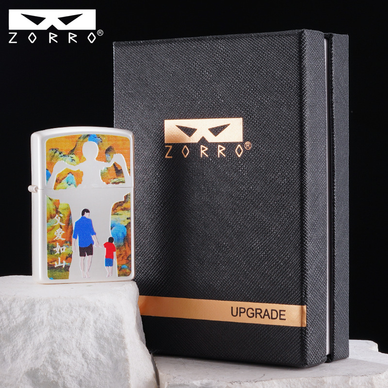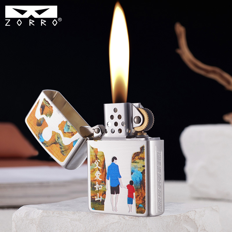 zorro佐罗正品砂轮煤油打火机铜壳子二代包银色父爱如山彩绘图案
