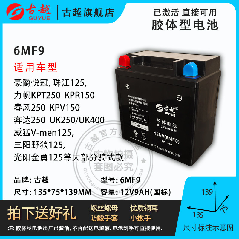 古越12N9-4B-1/6MF9三轮车125摩托车水电瓶12v伏蓄电池9ah通用150