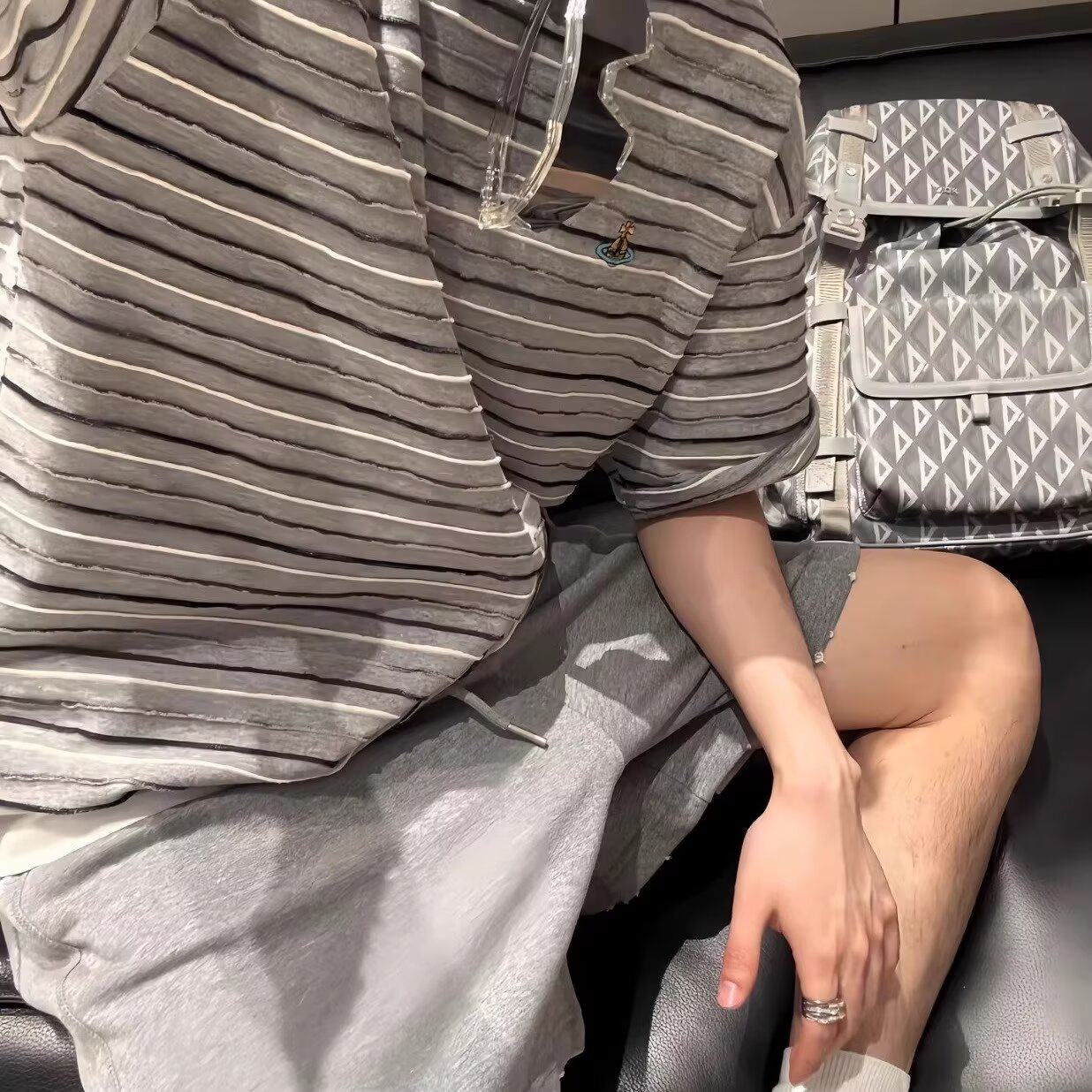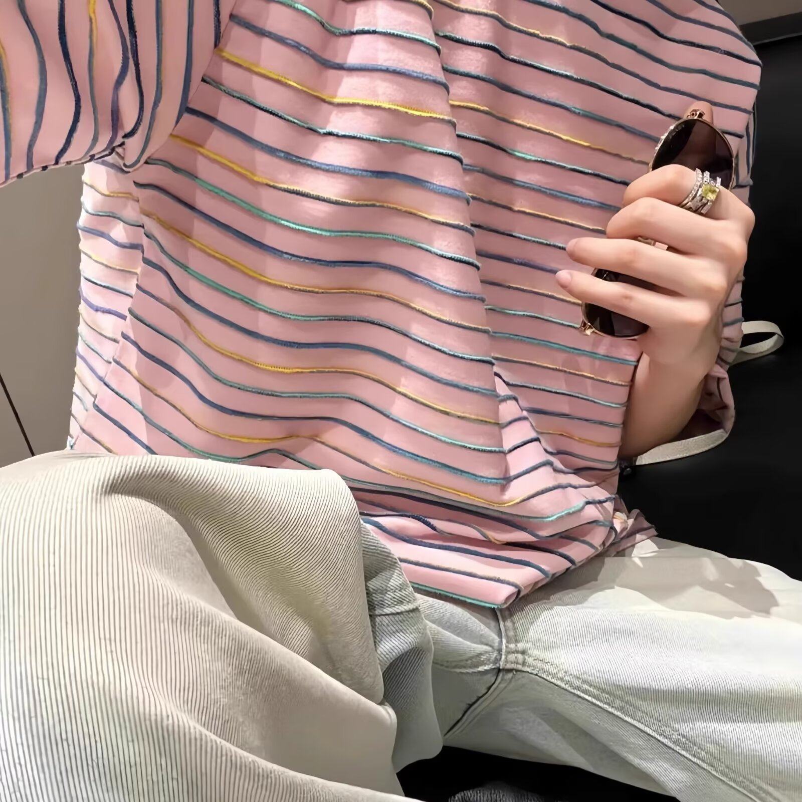 夏季重磅纯棉条纹小领口宽松短袖T恤男女撞色潮牌高街半袖体恤衫