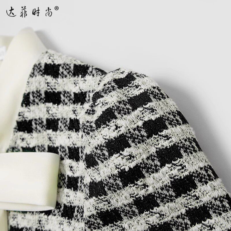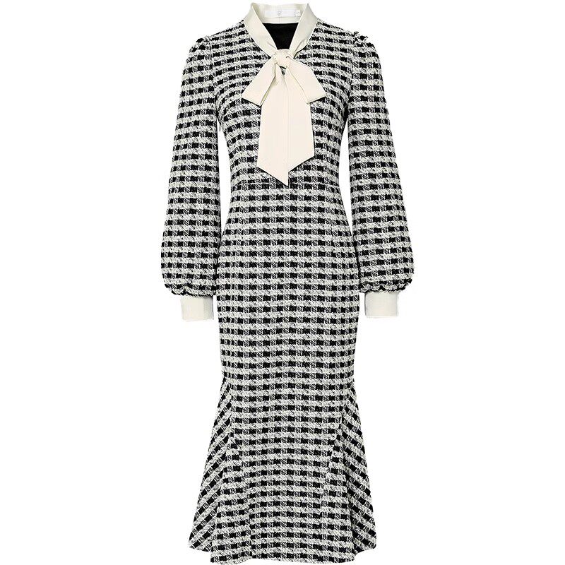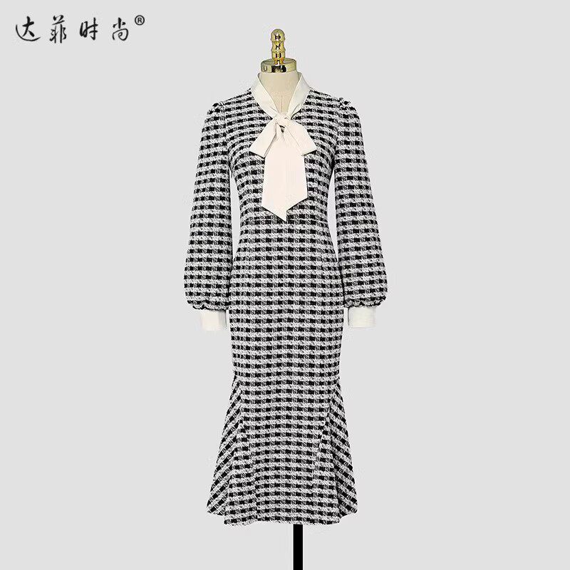 2025秋冬季新款女装时尚气质OL风灯笼袖黑色格子收腰鱼尾连衣裙