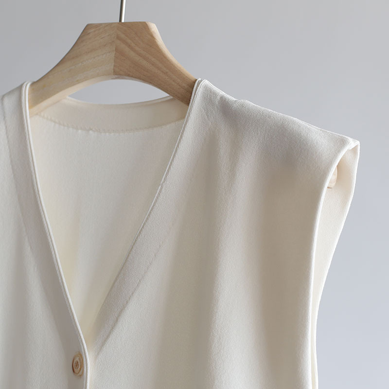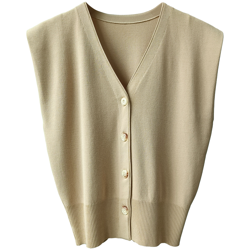 法式V领无袖开衫春夏季冰丝曲珠垫肩马甲高腰短款针织上衣通勤