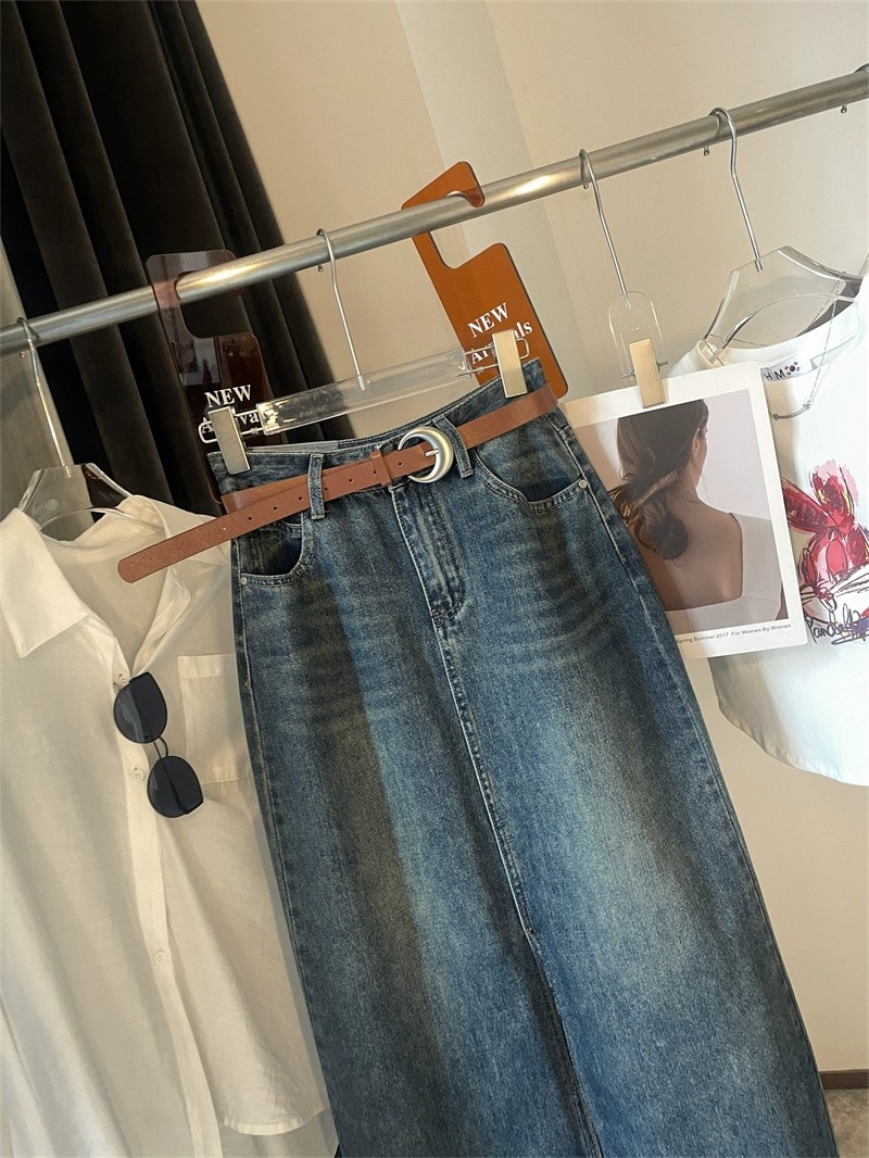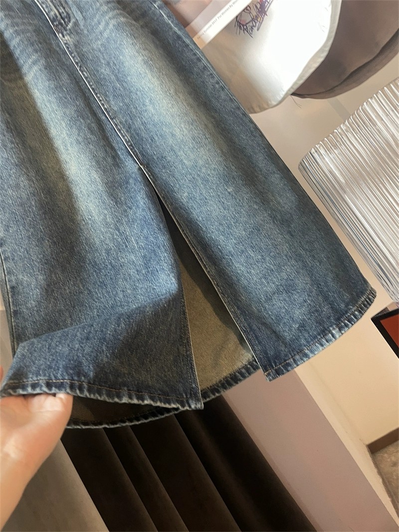 外贸女装~复古牛仔半身裙女高腰2023夏季新款显瘦中长款a字开叉裙