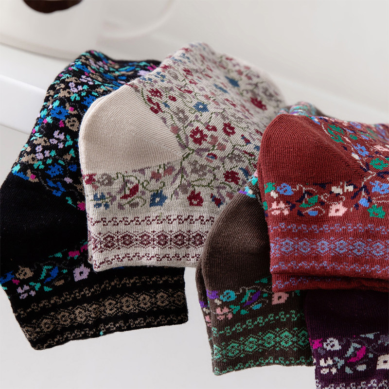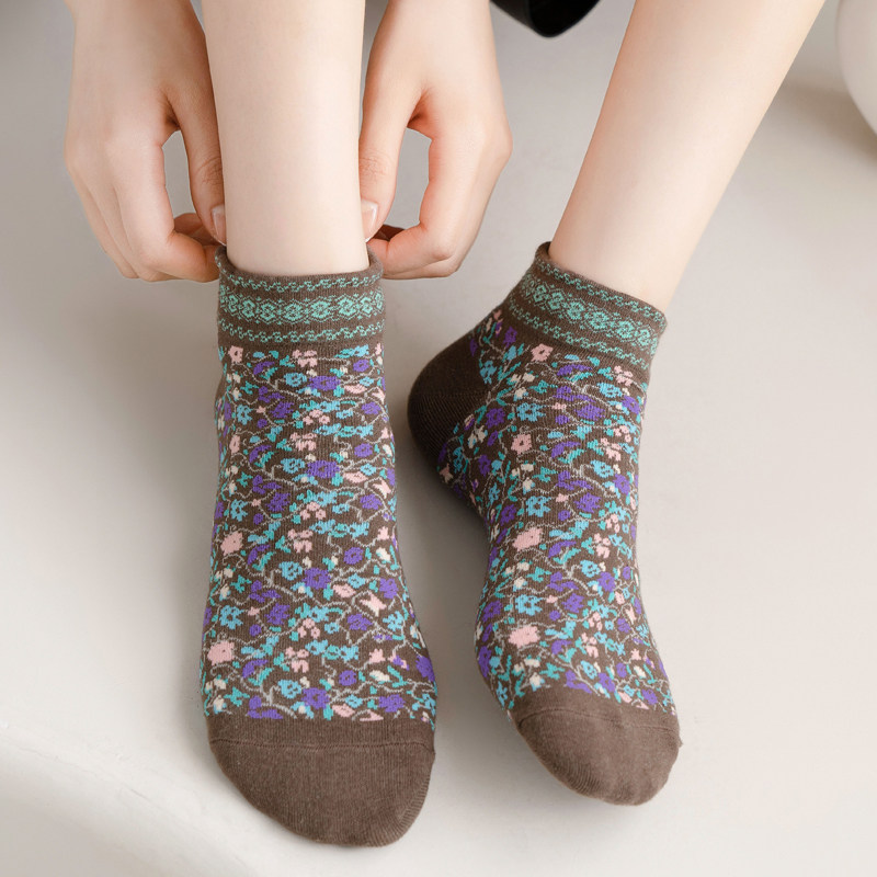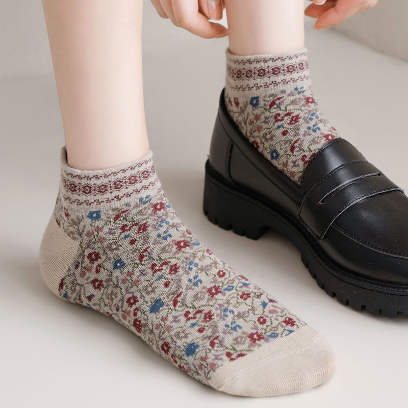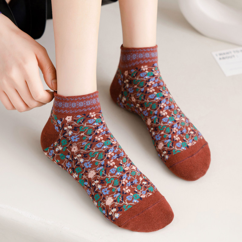 秋冬复古民族风碎花短袜森女百搭小花袜子纯棉春秋浅低腰短筒船袜