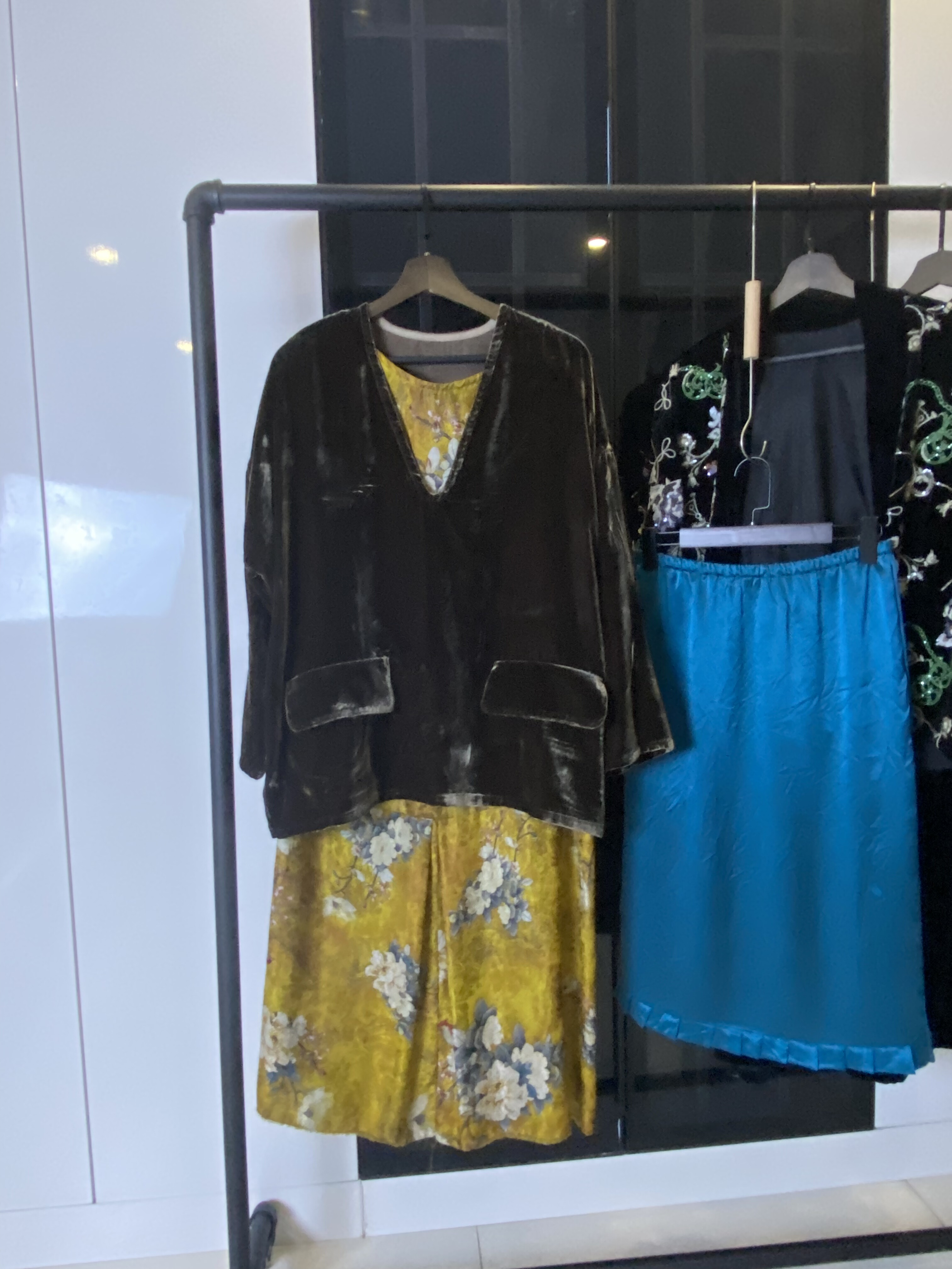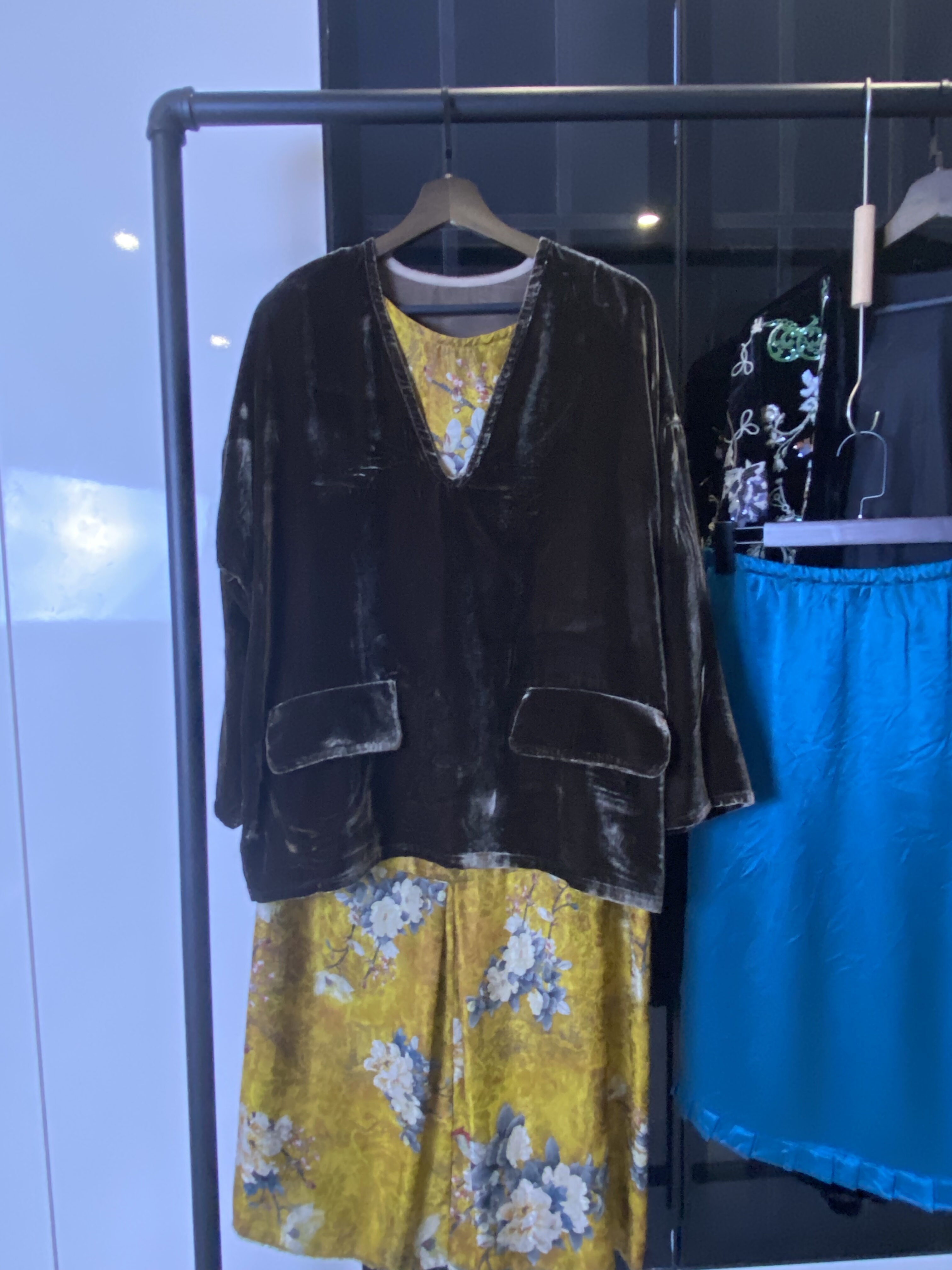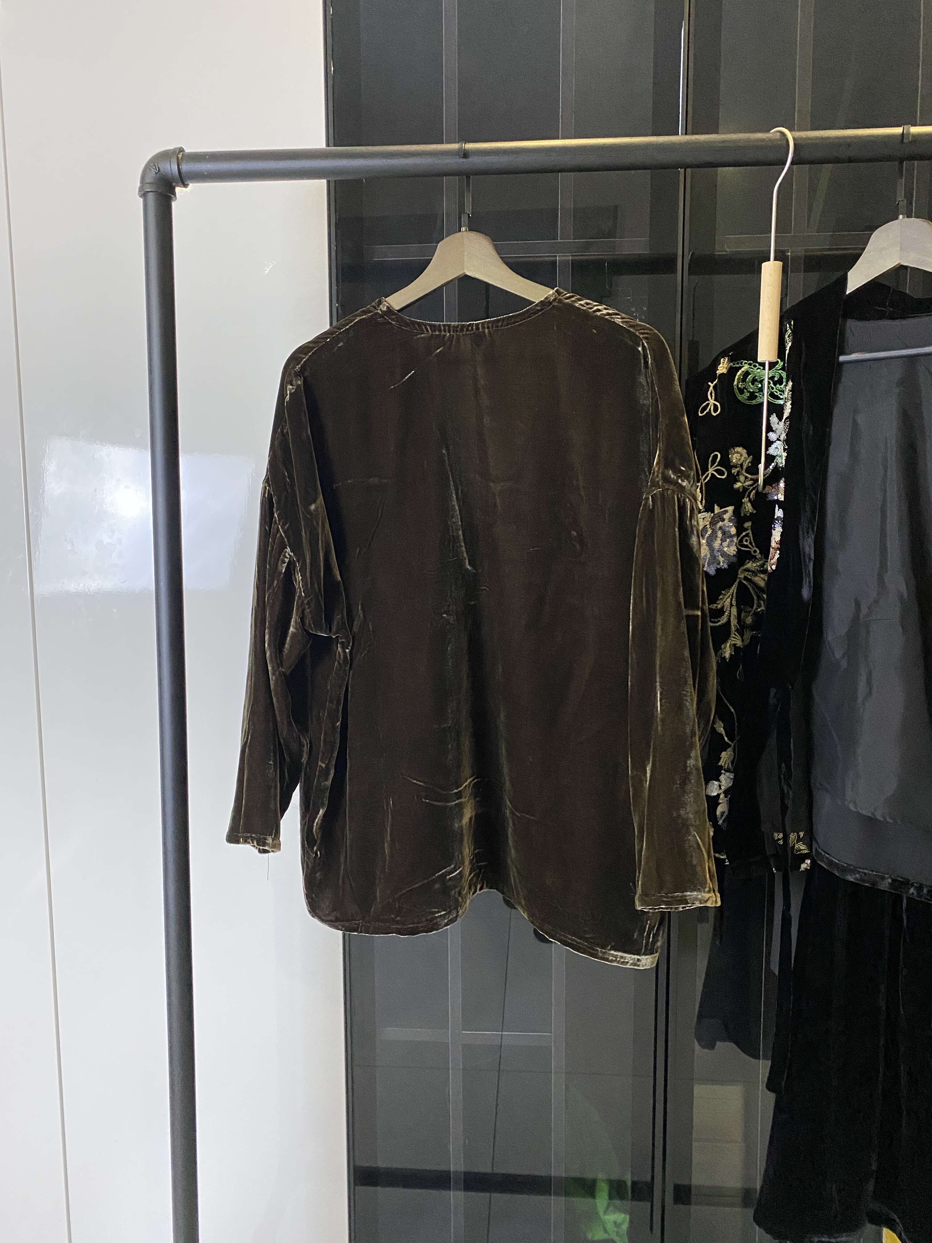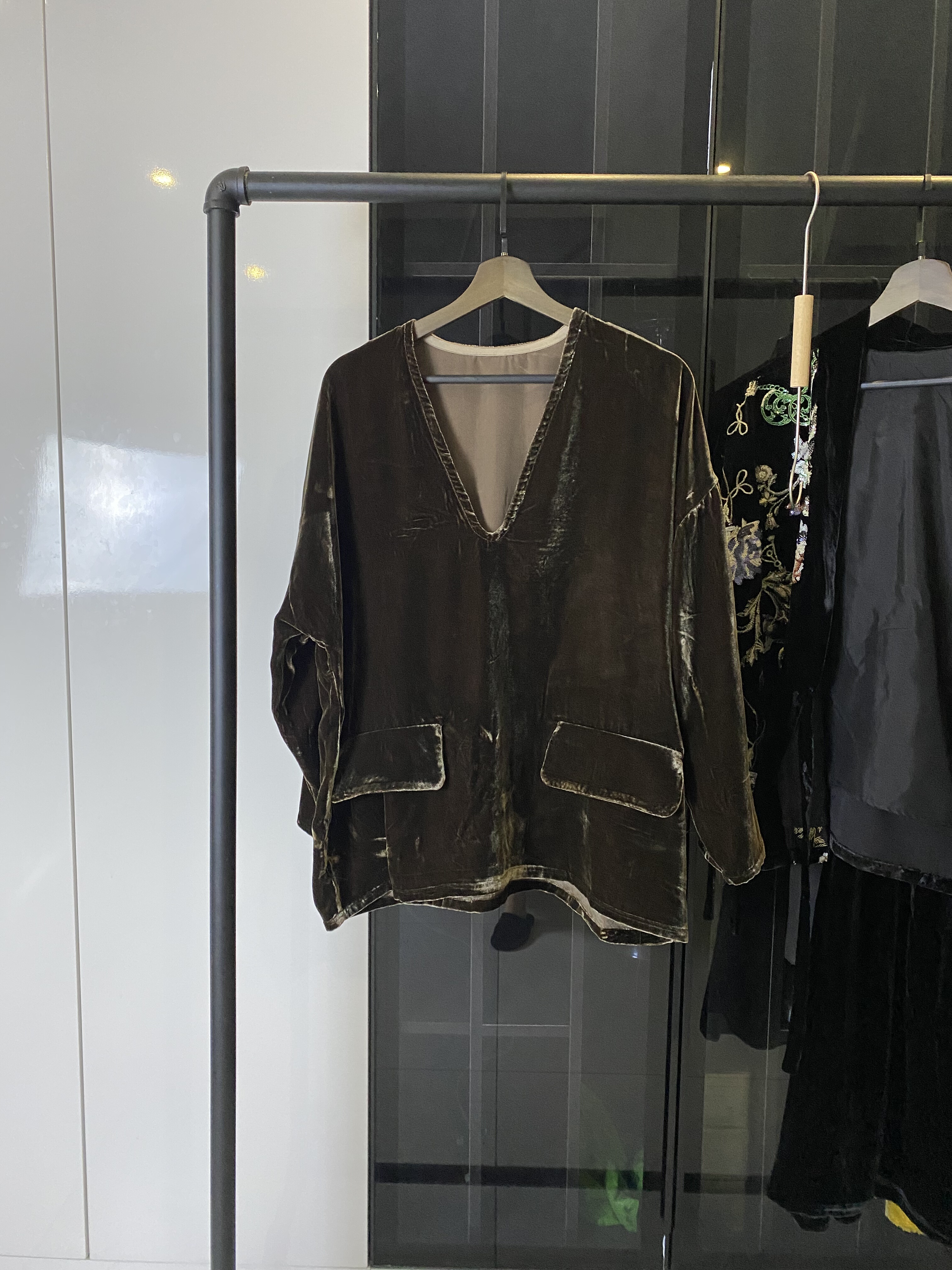 真丝丝绒休闲慵懒风宽松上衣深V领衬衫落肩袖胸围133衣长65