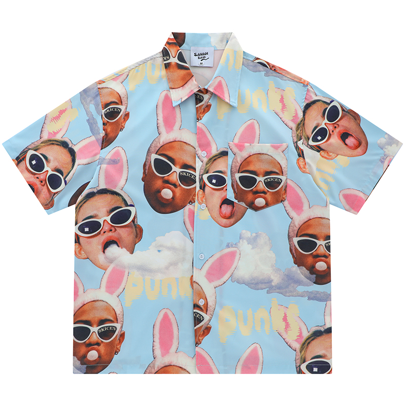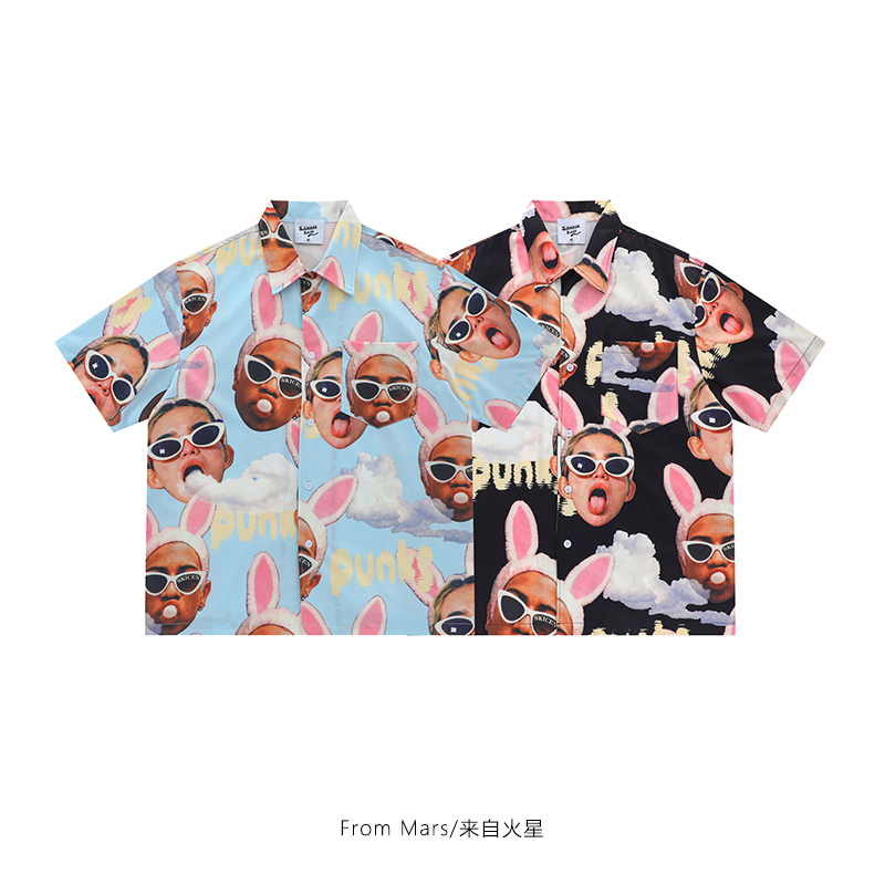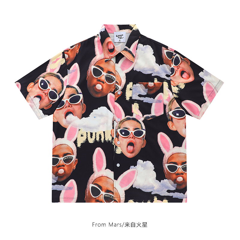 From Mars 多巴胺派对 潮流美式匹布印花短袖衬衫hiphop夏季宽松