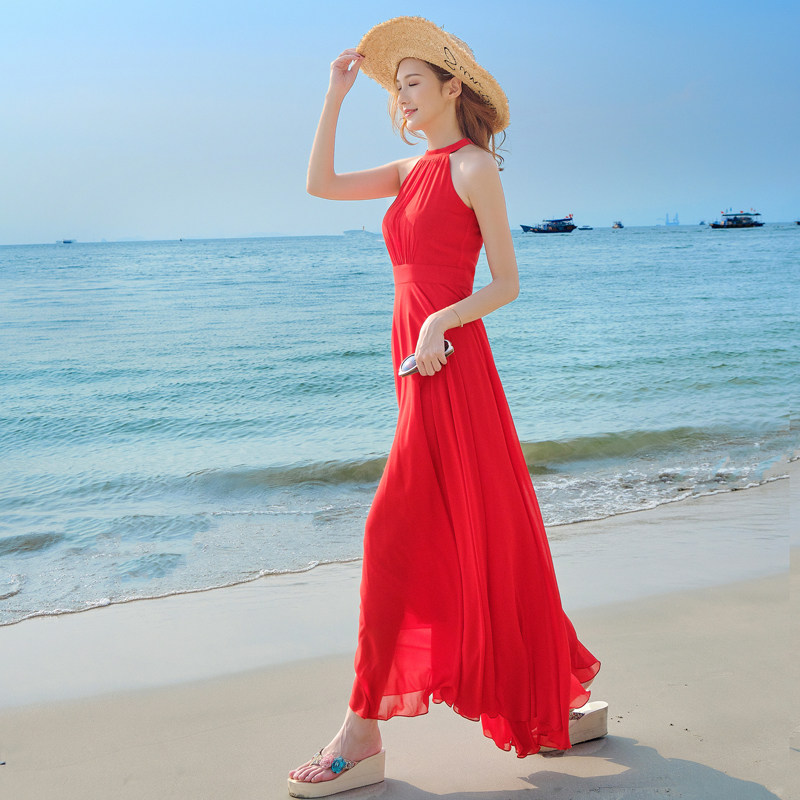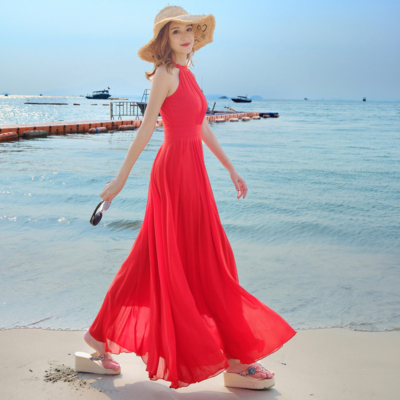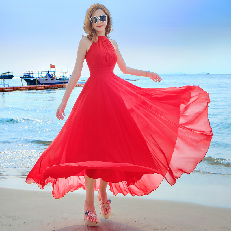 无袖挂脖连衣裙长款女夏性感露肩气质晚礼服白色沙滩度假雪纺长裙