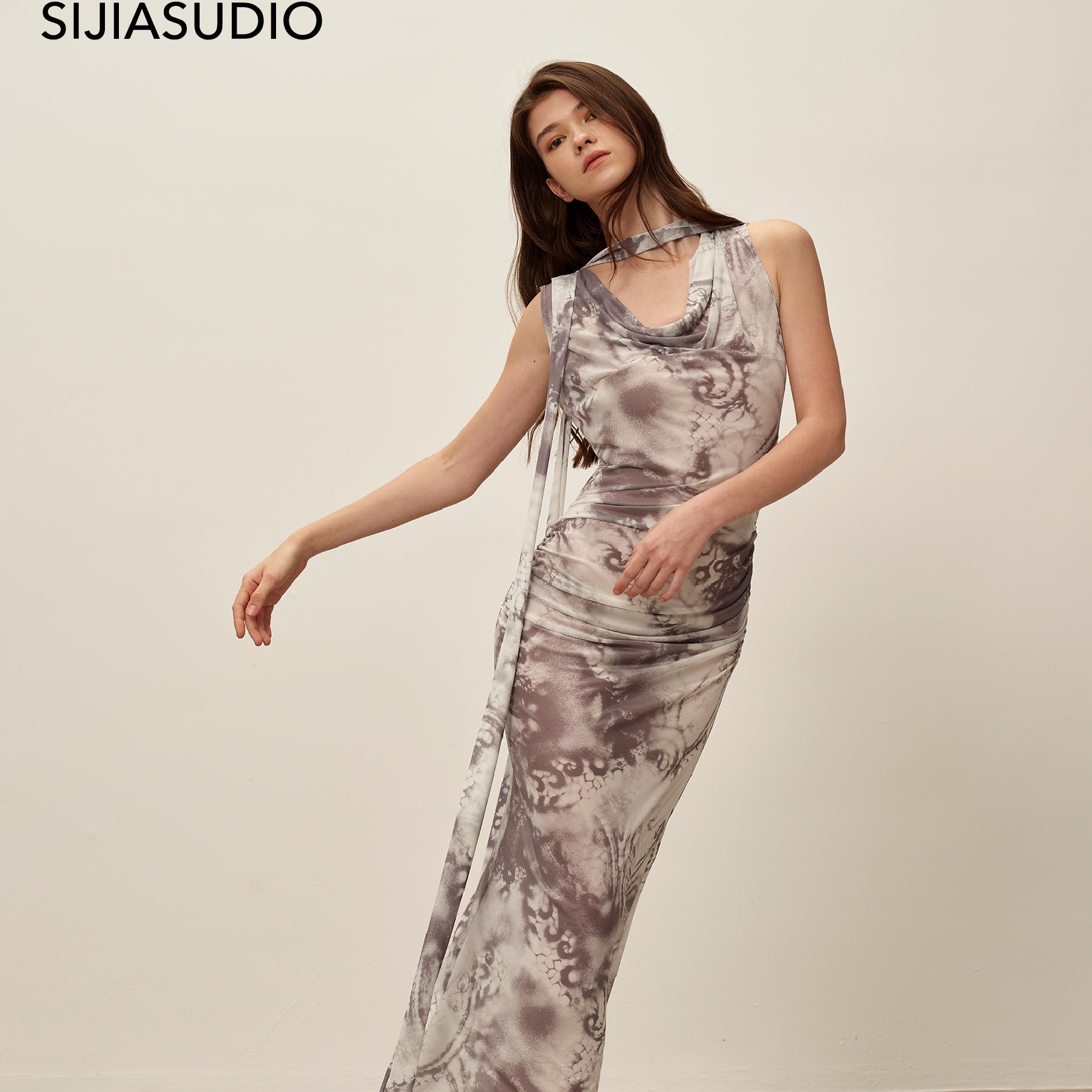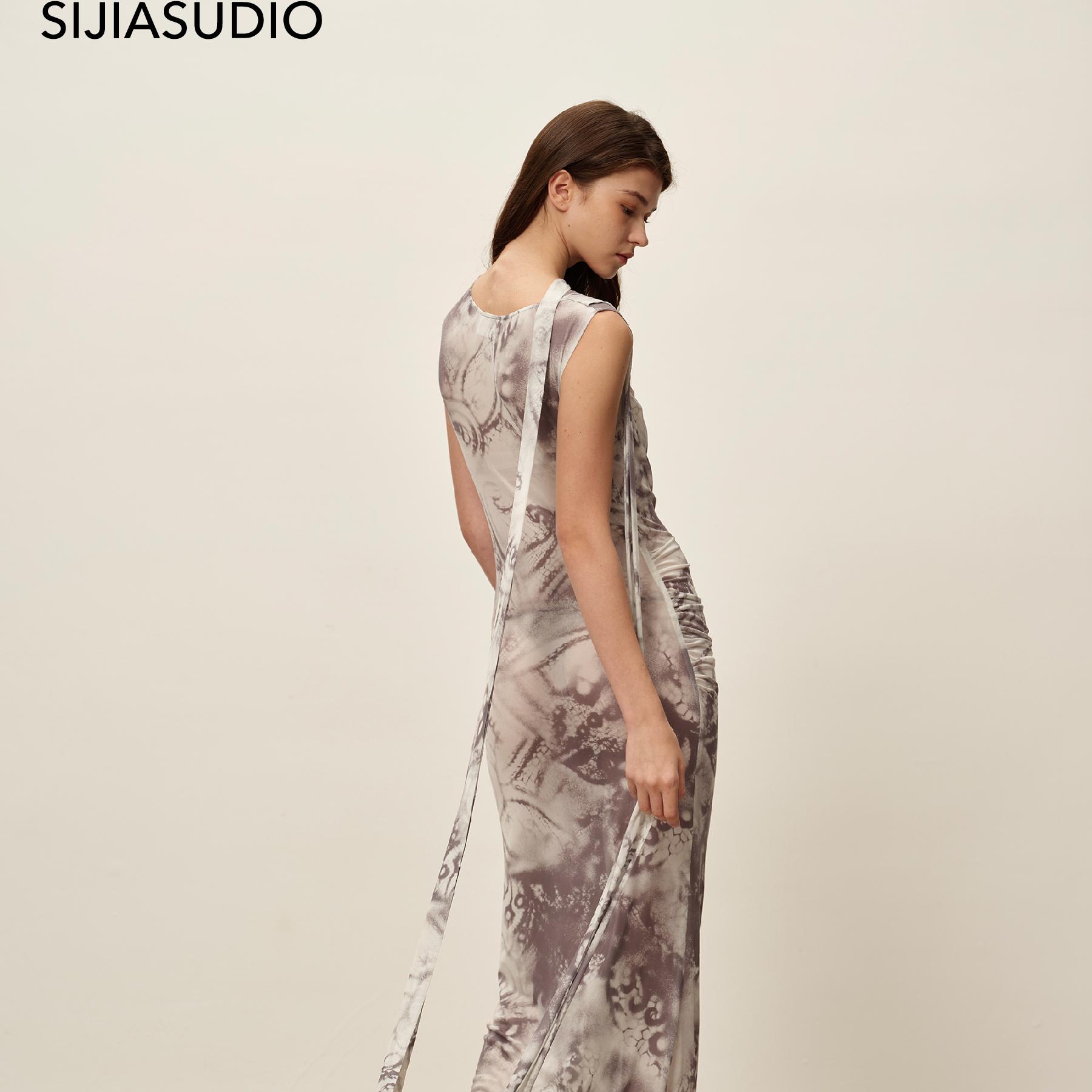 SIJIA环保小众原创设计师品牌2025年夏印花网纱荡领飘带连衣裙女