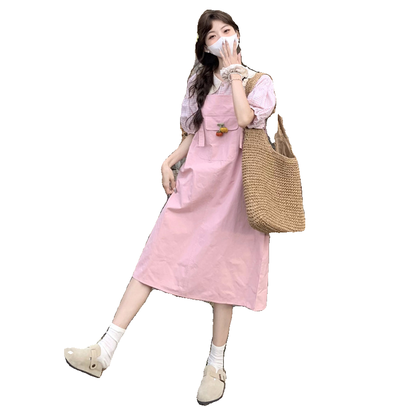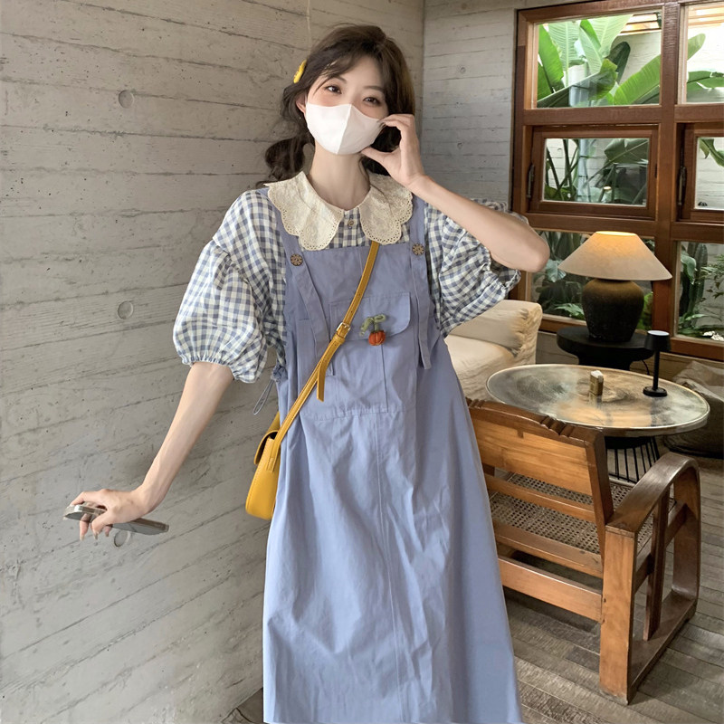 大码女装2025夏季胖mm复古格子娃娃领衬衣+设计感抽绳背带裙套装