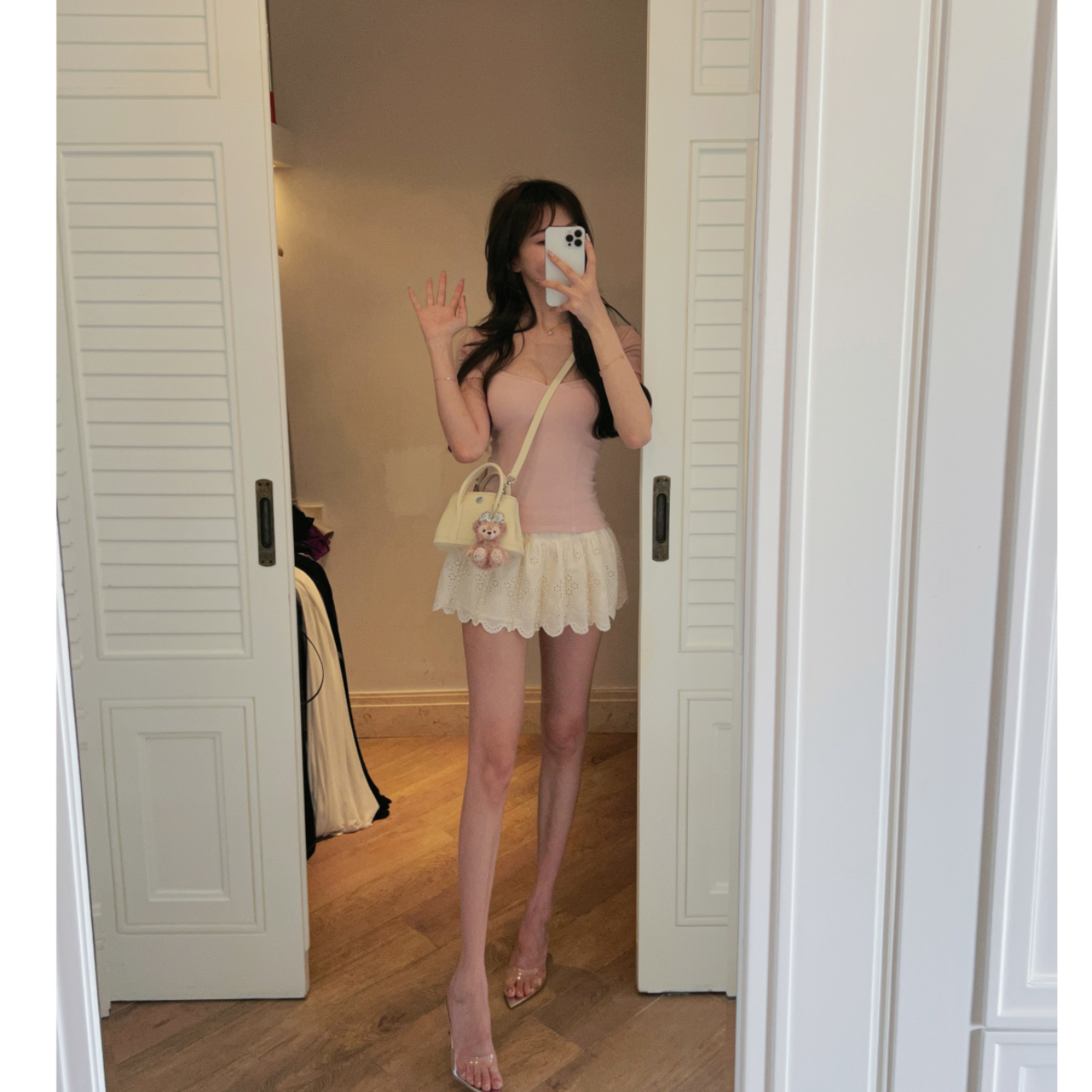 IN MIMIFACE 白色蕾丝拼接绣花半身裙女春季芭蕾镂空花边a字短裙