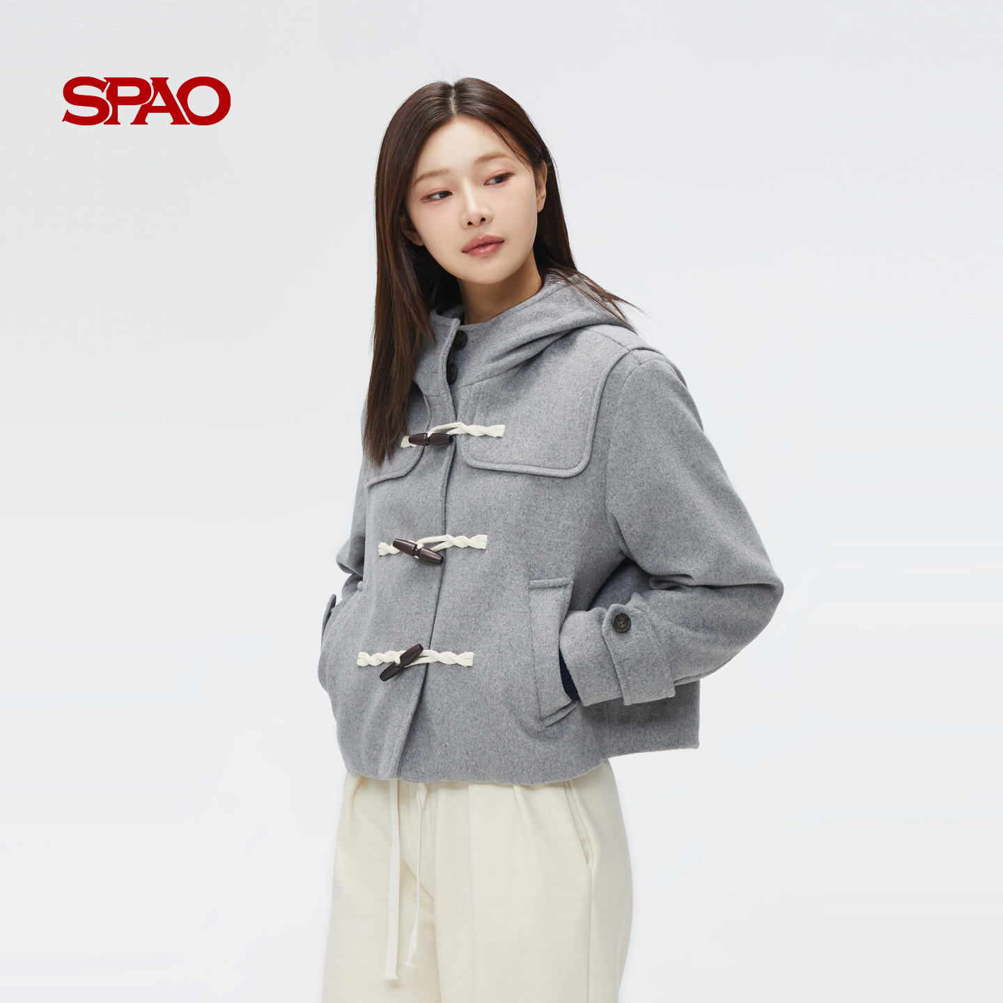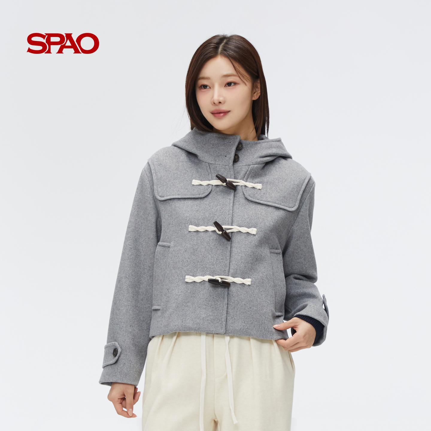 SPAO韩国同款25年春秋女士气质时尚学院风短款牛角扣毛呢外套