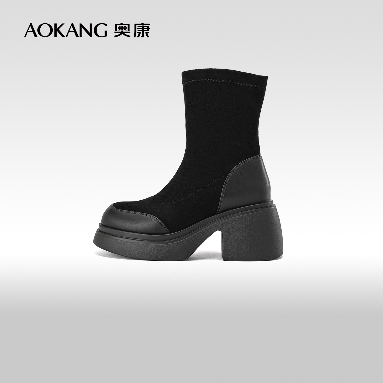 奥康女鞋 冬季新款时尚拼接袜靴厚底增高百搭时装靴简约短靴