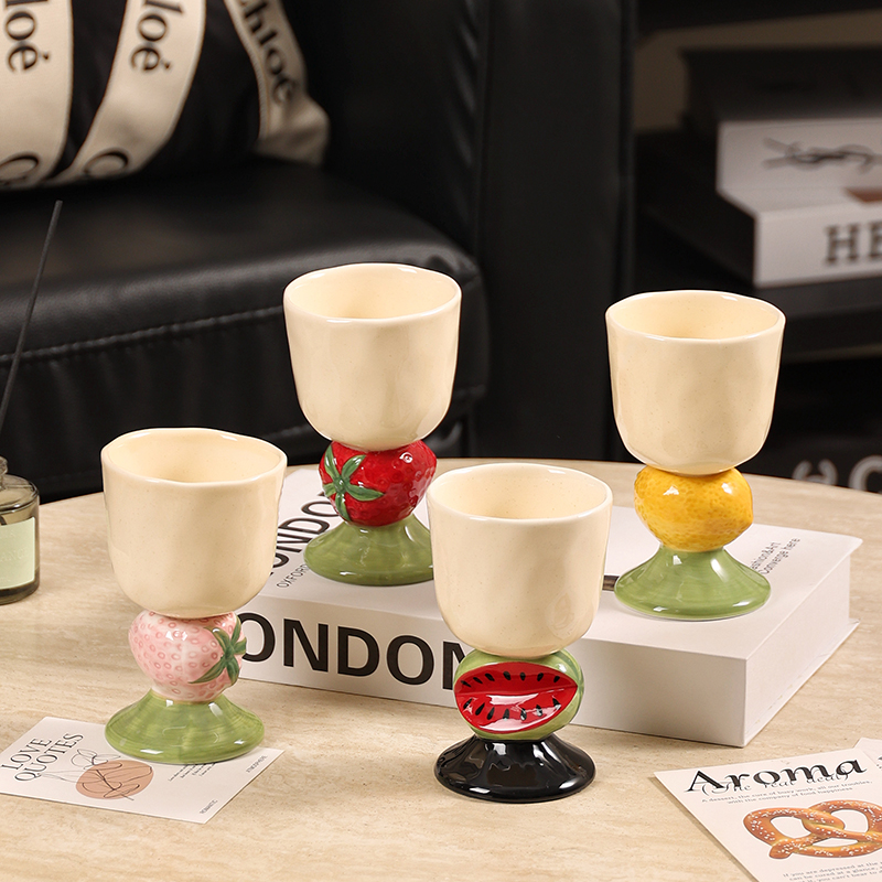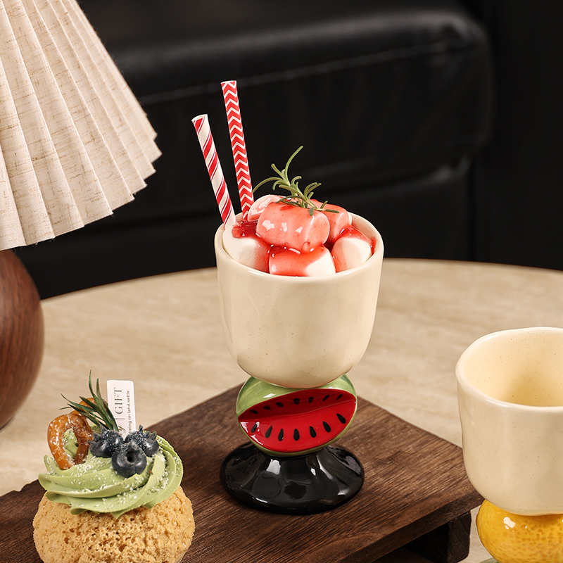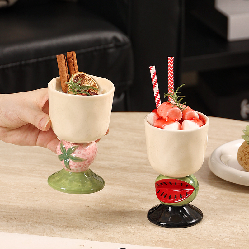 草莓西瓜杯子陶瓷高脚杯儿童可爱果汁杯冰淇淋杯创意甜品杯高颜值