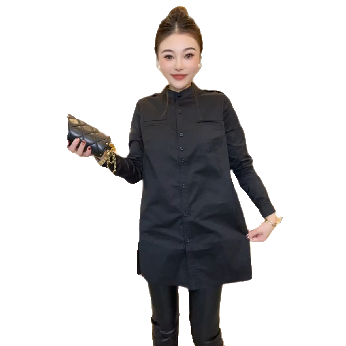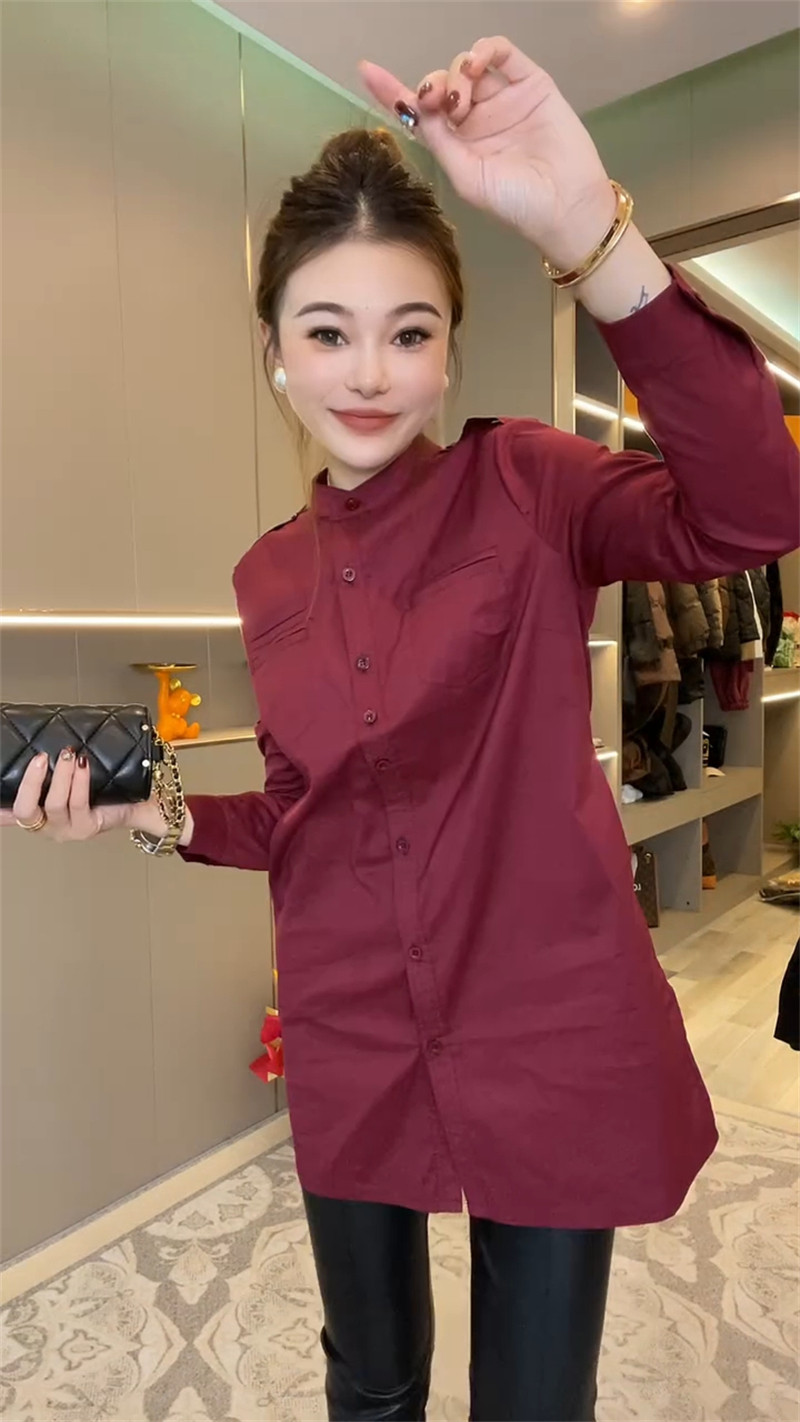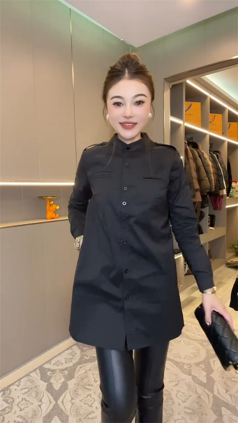 通勤长袖开叉立领肩章中长款衬衫
