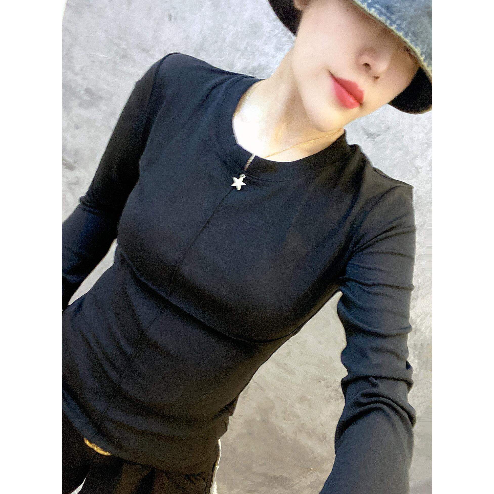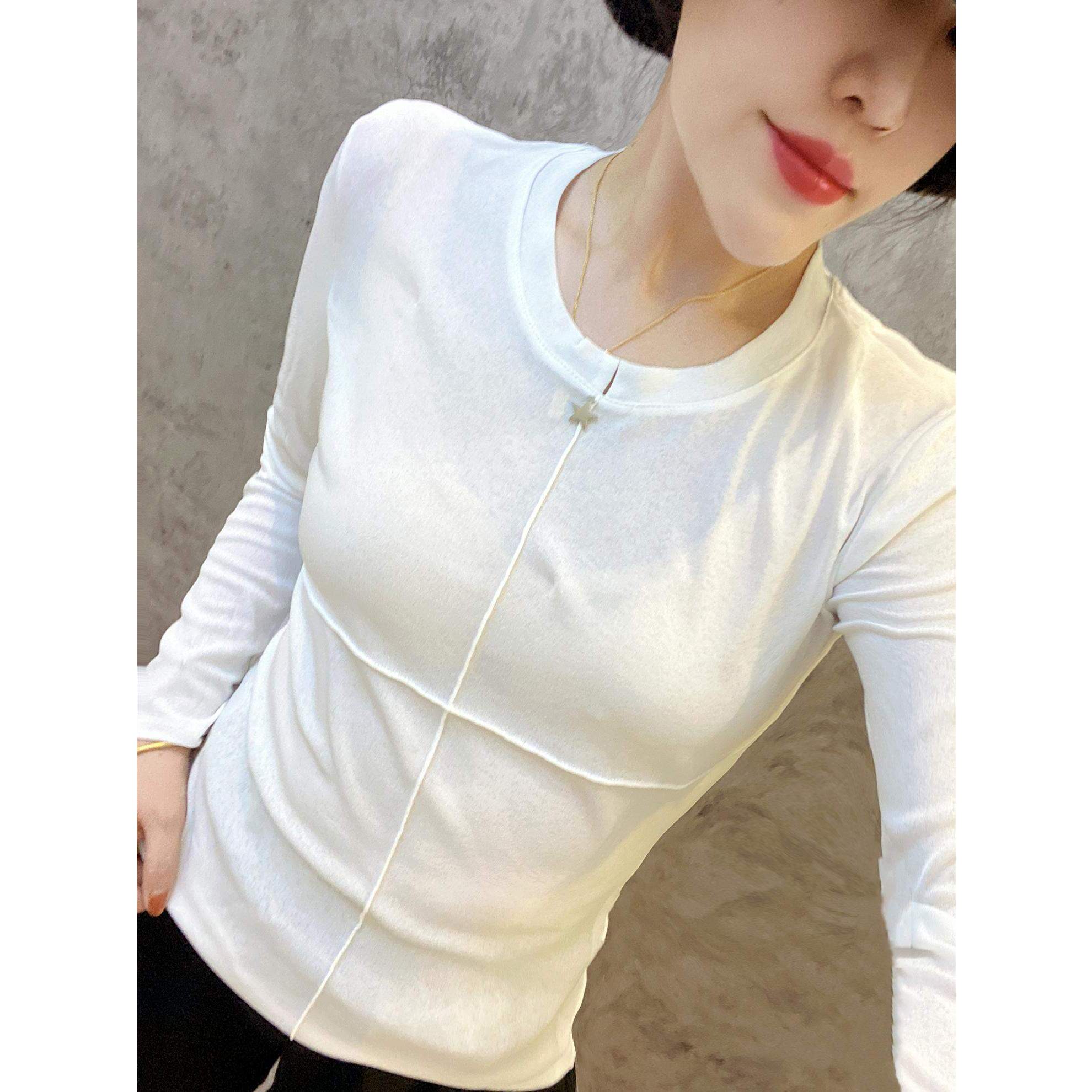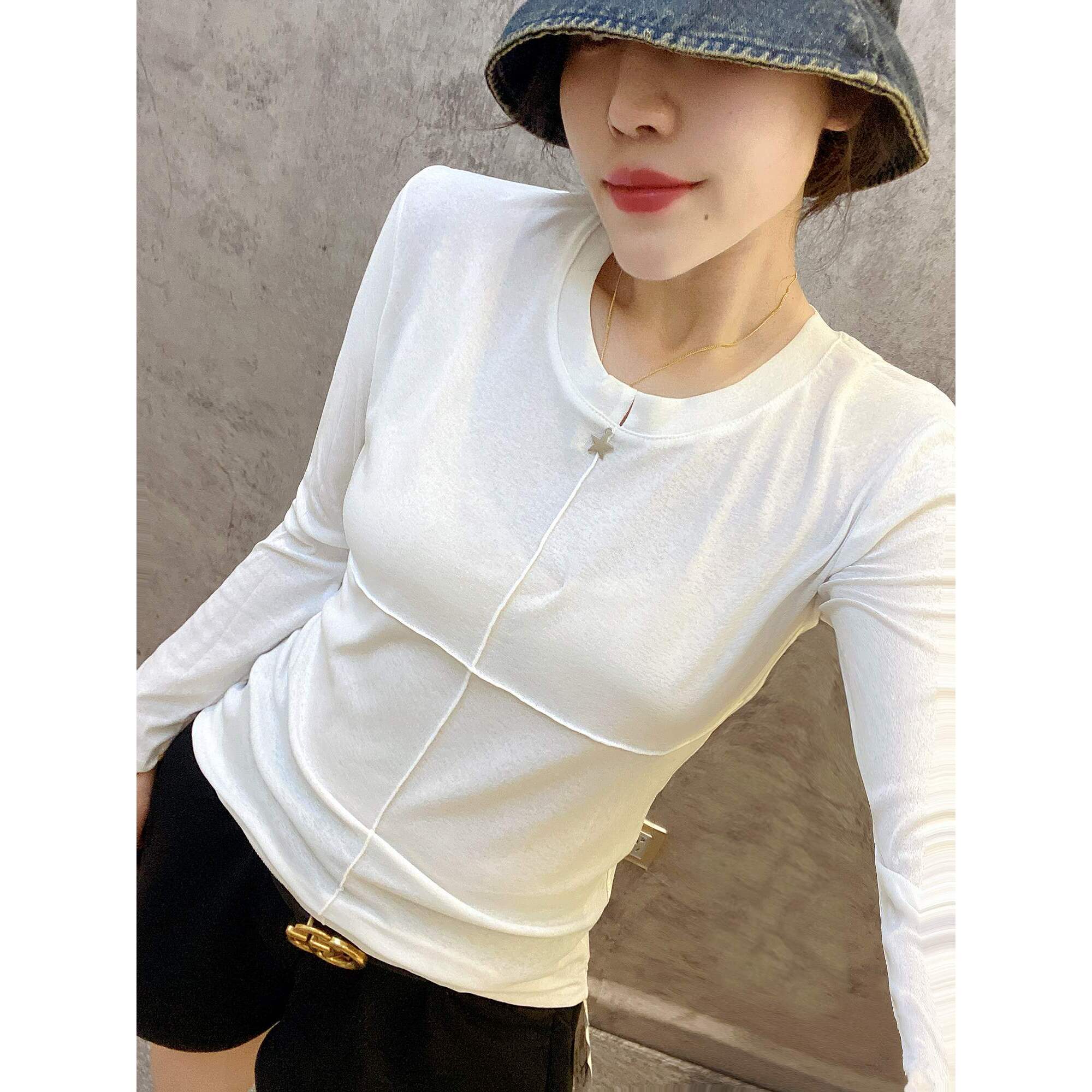欧货洋气小衫黑白拼接圆领弹力修身长袖T恤小衫打底衫简约时尚潮