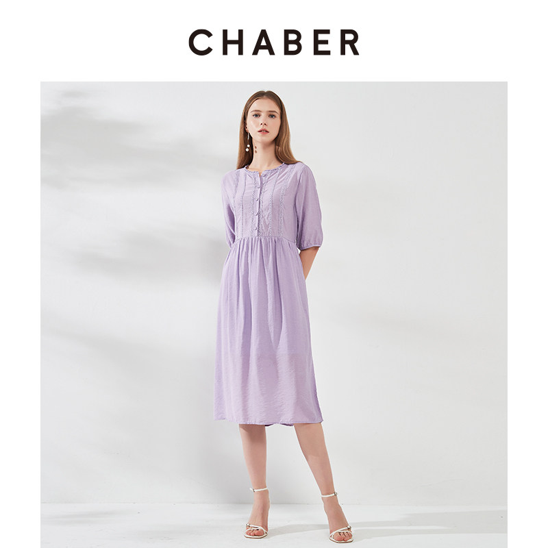 chaber巧帛夏季新款半开襟蕾丝拼贴宽松休闲风优雅简约女连衣裙