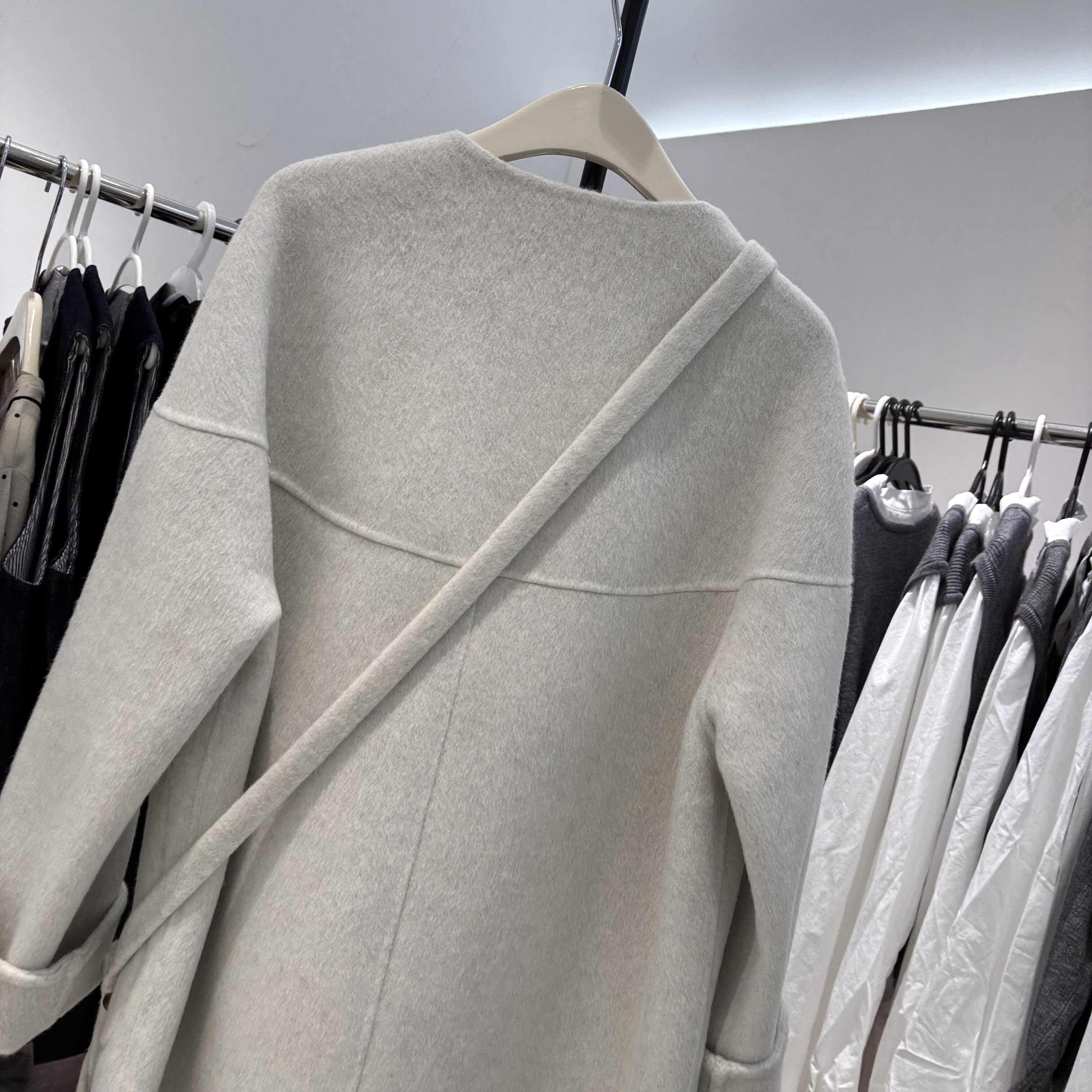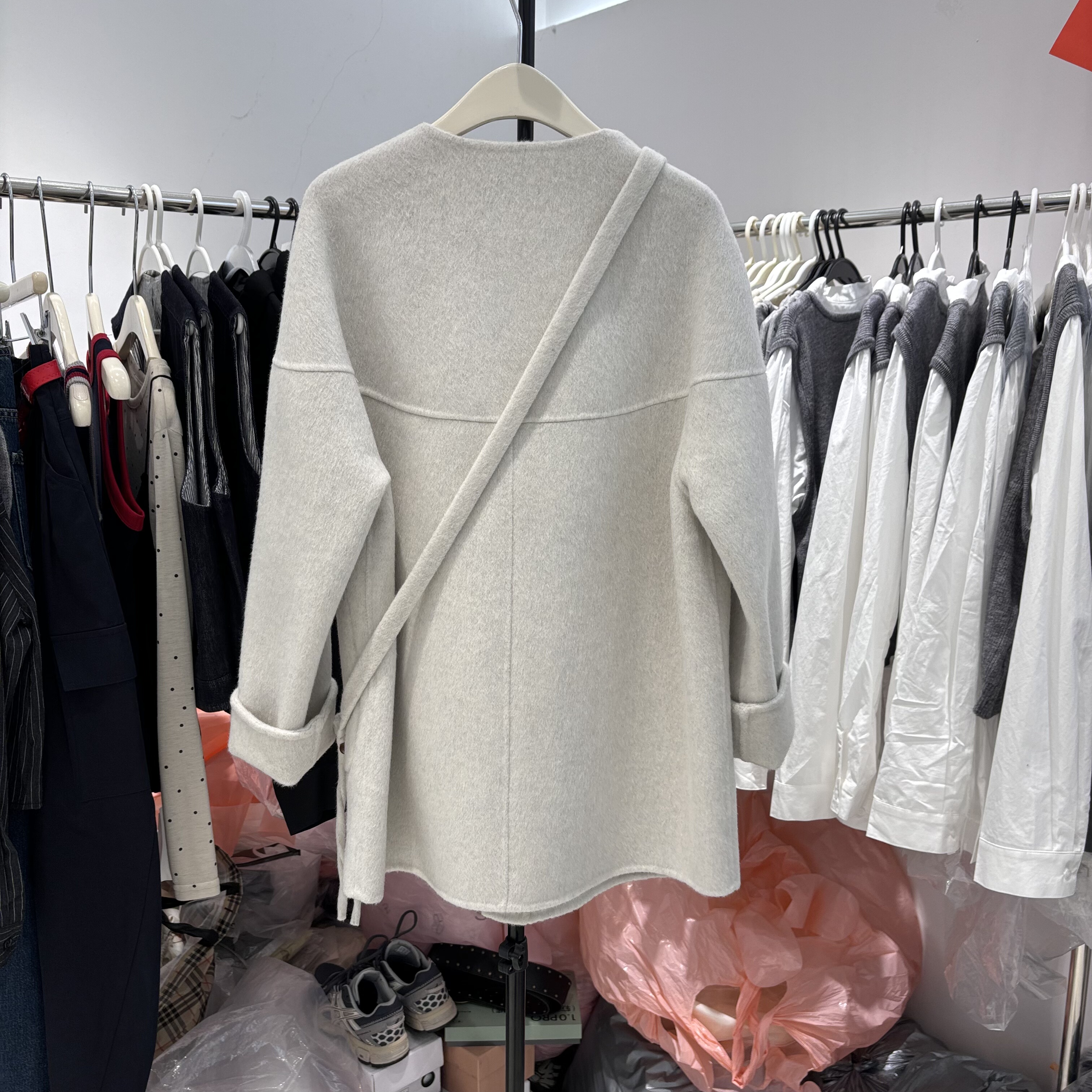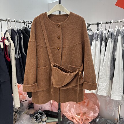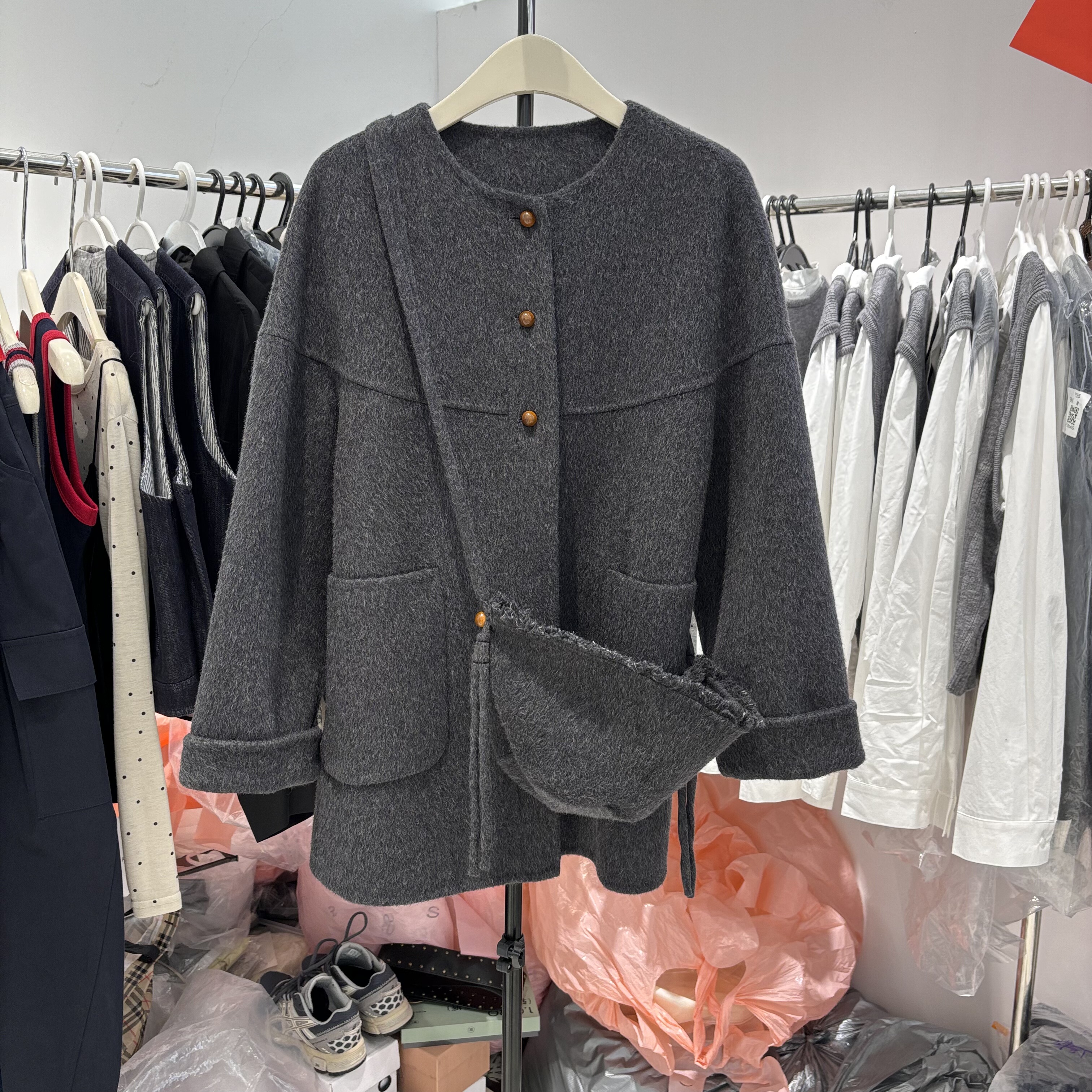 设计感圆领单排扣毛呢外套女中长款双面羊绒大衣2025秋冬款配包包
