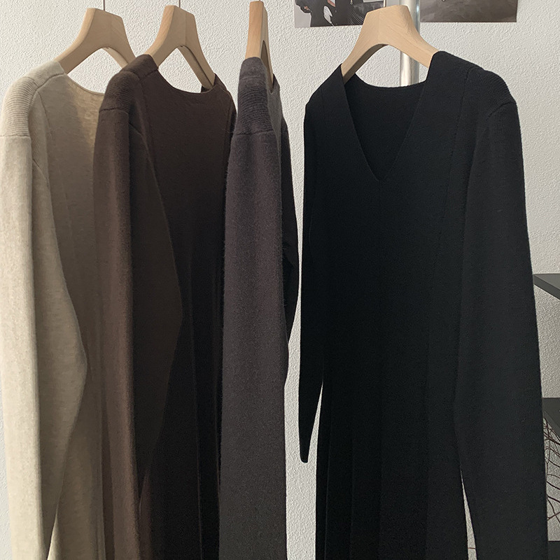 法式气质温柔风V领长袖针织连衣裙女秋冬季修身显瘦A字打底长裙子