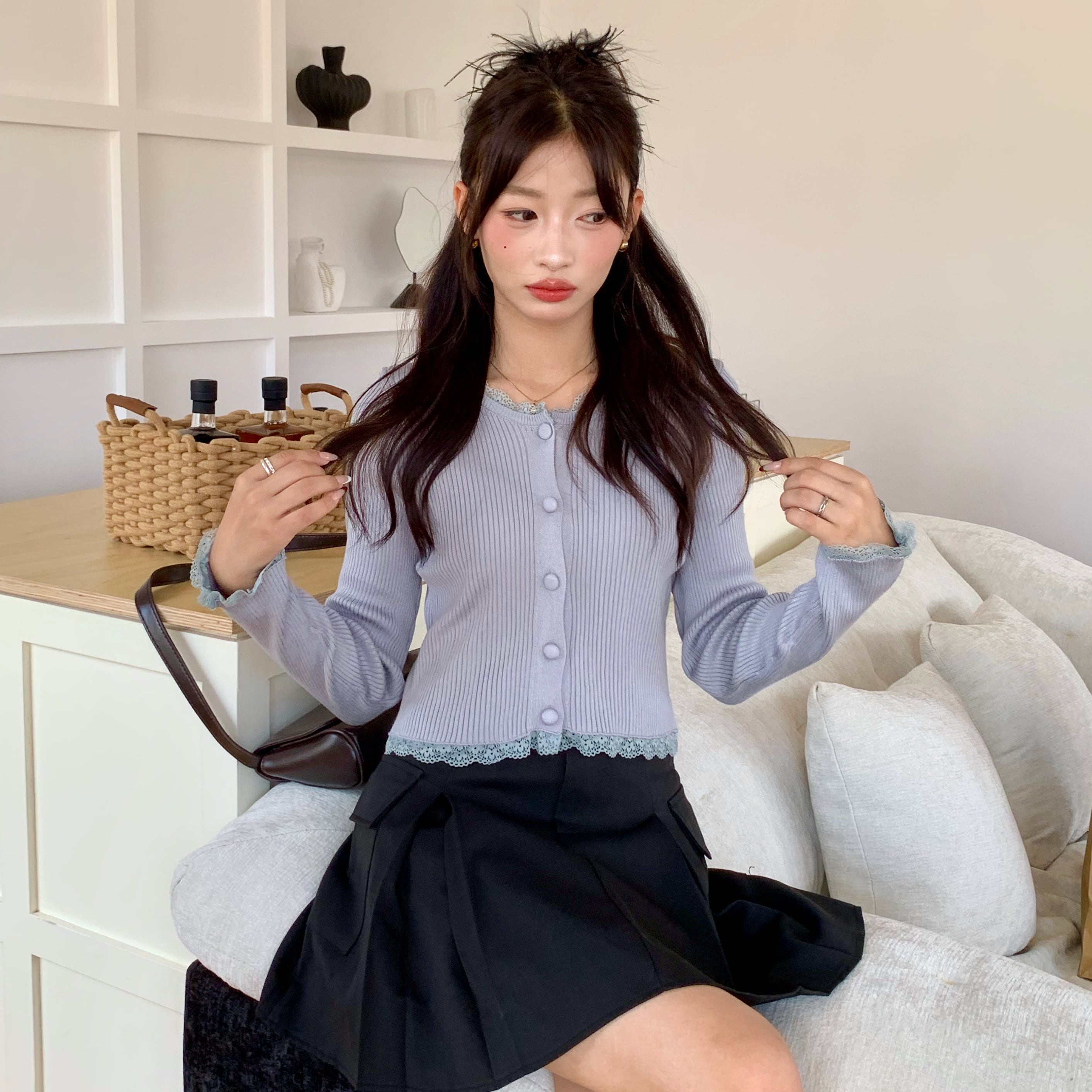 韩版复古短款早秋款蕾丝拼接单排扣修身长袖外套针织衫打底上衣女