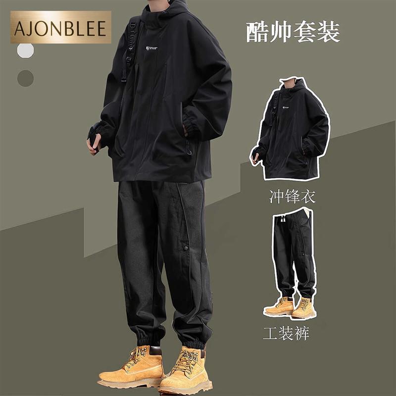 登山服黑武士冲锋衣男套装春秋美式潮牌连帽工装夹克男装一套搭配