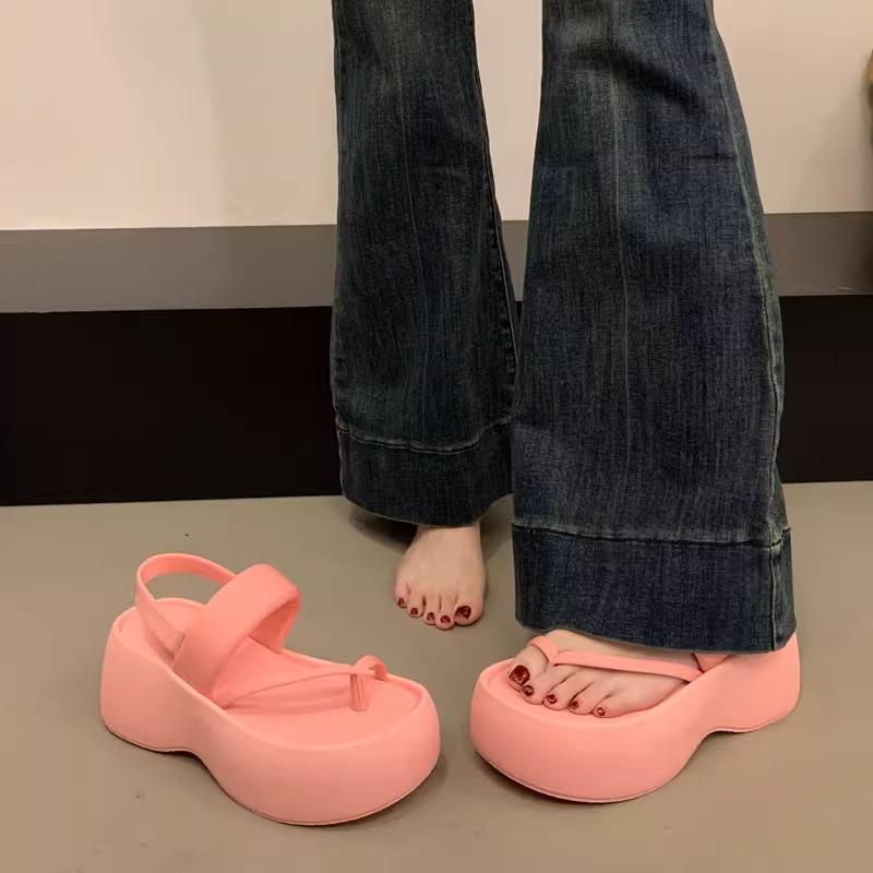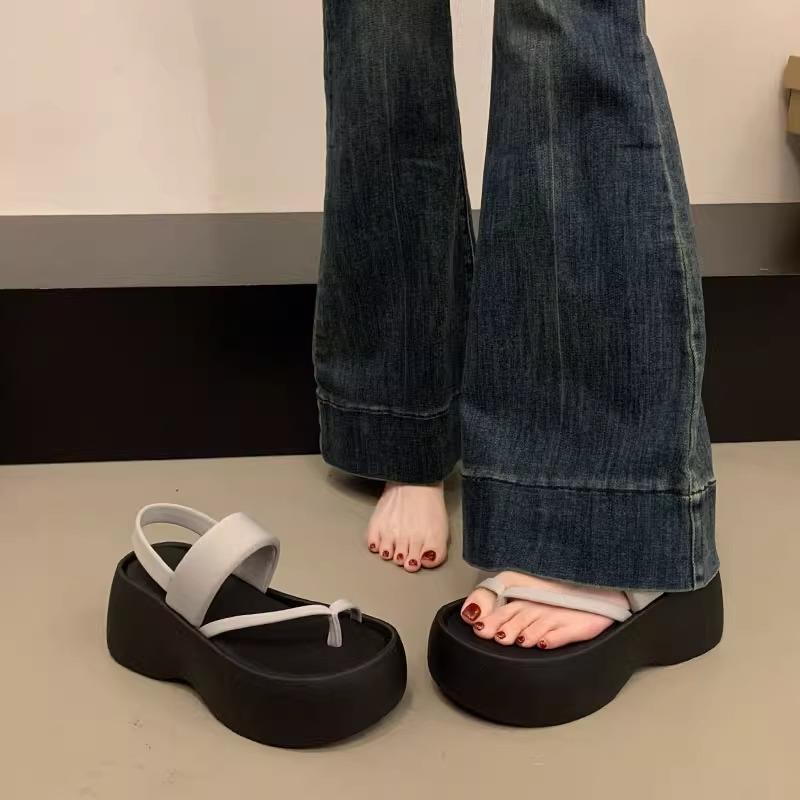 香港真皮松糕厚底夹趾人字拖鞋女夏季2025新款小个子增高沙滩凉鞋
