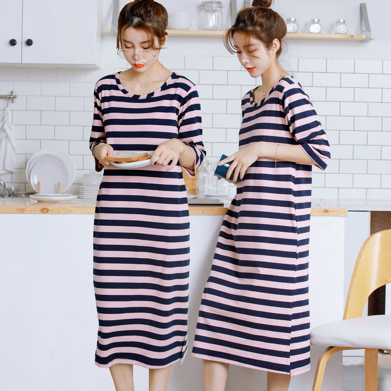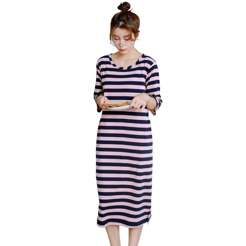 睡裙女秋纯棉长款长袖韩版春夏季中袖睡衣宽松大码孕妇可外穿长裙