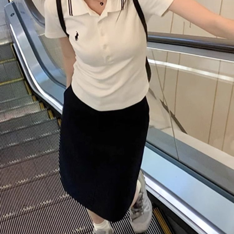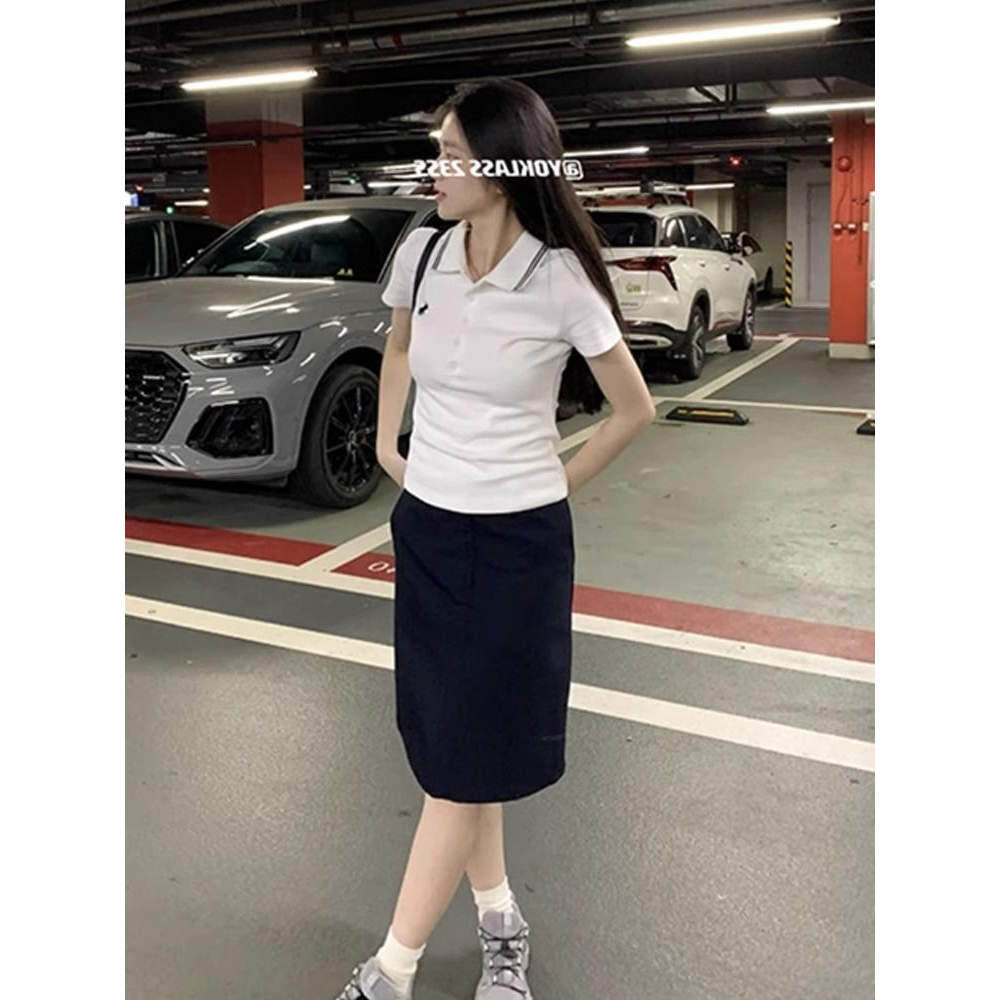 独特设计感夏季法式修身白色polo翻领刺绣纯棉正肩短袖T恤女上衣