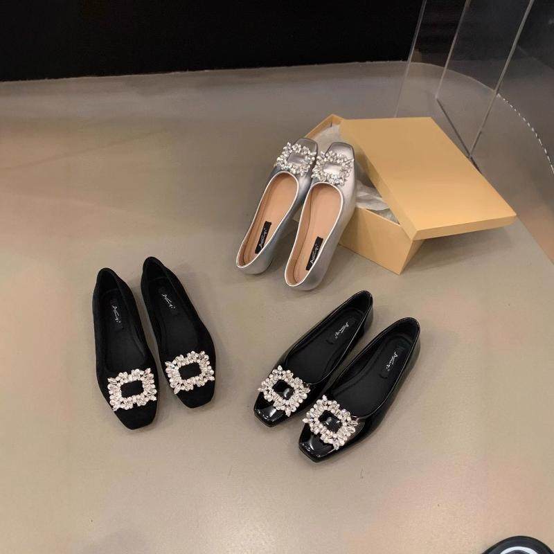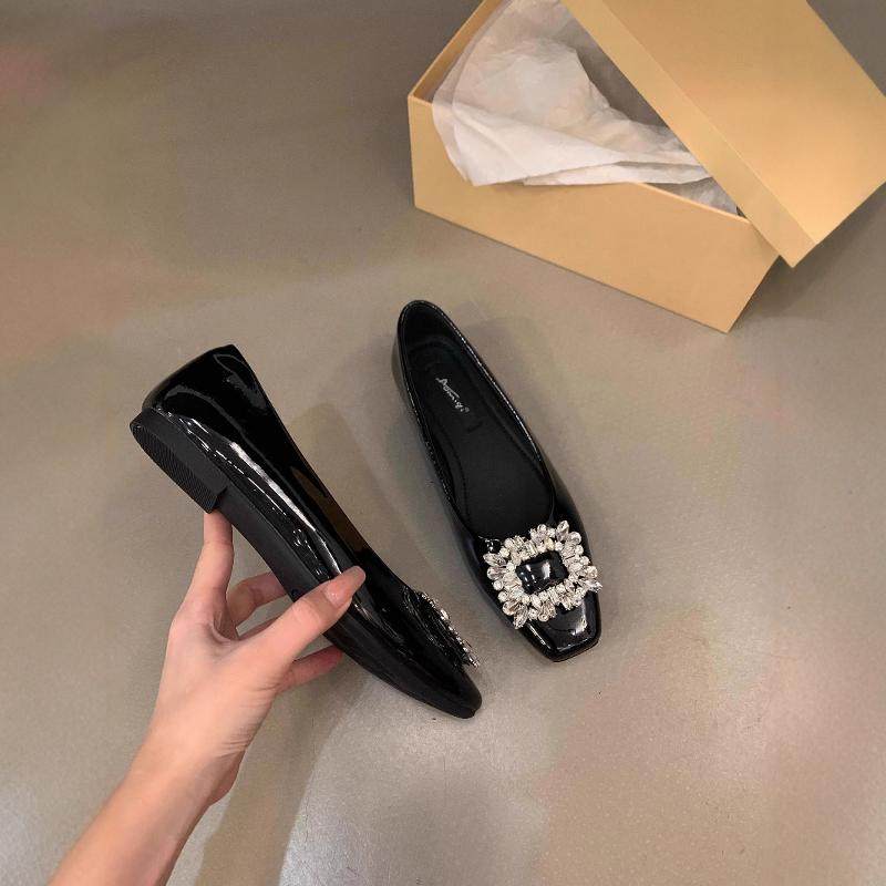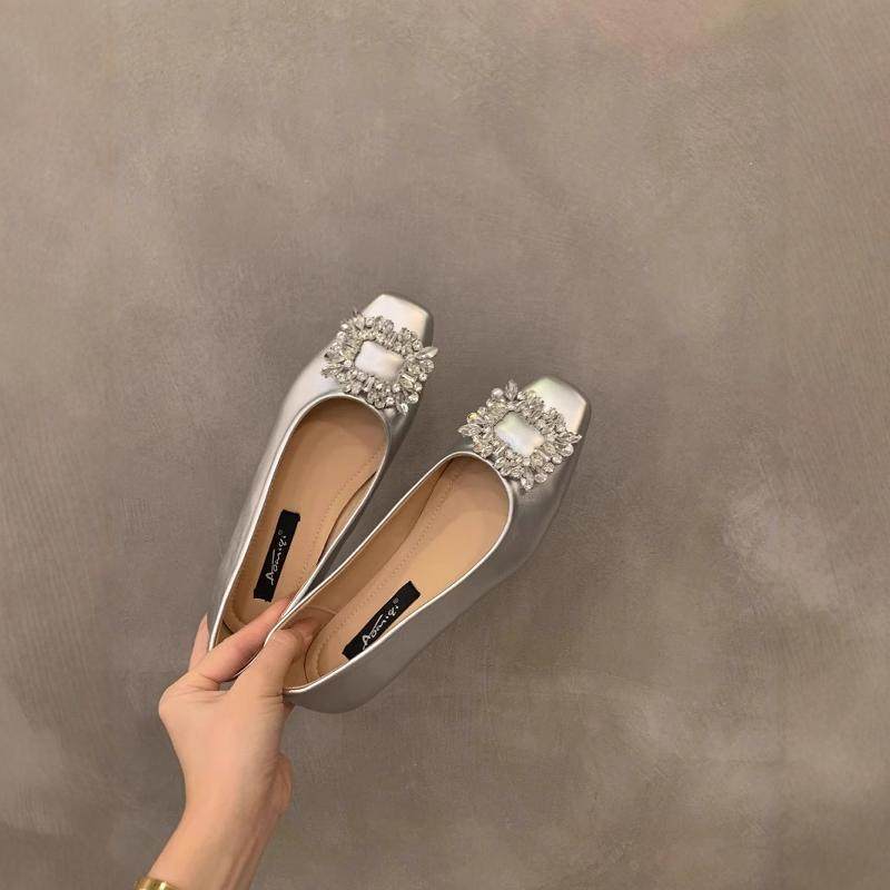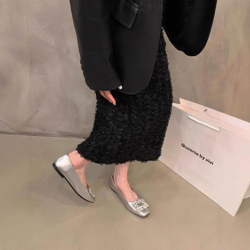 品牌撤柜真皮法式高级感平底单鞋女2024年新款方头水钻软底豆豆鞋