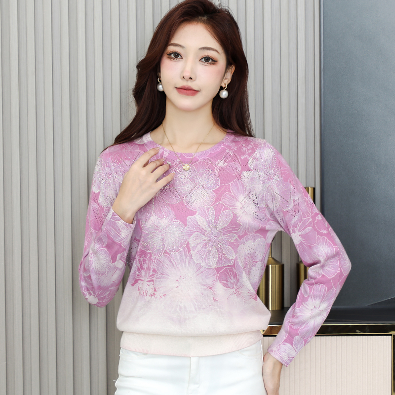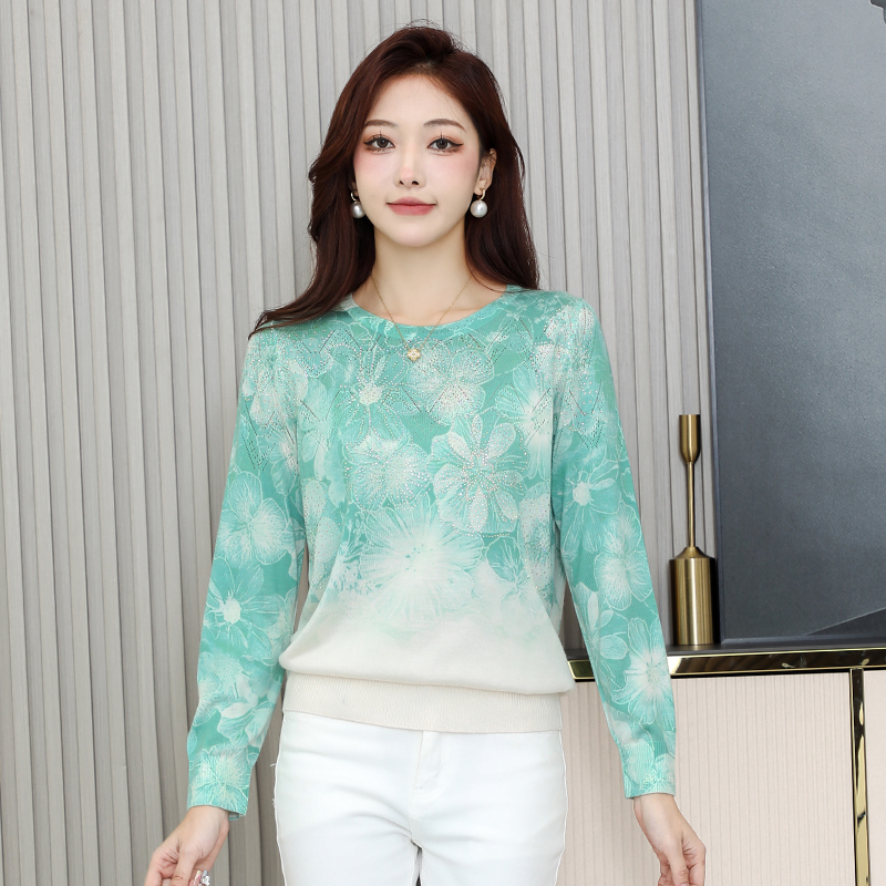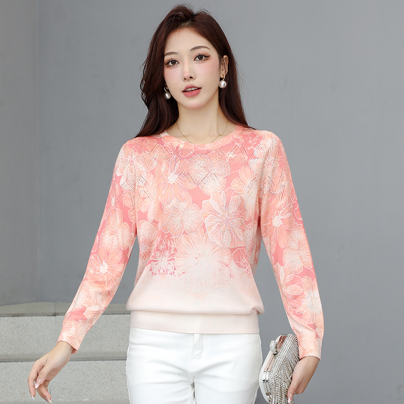 25年春新款荣澜天丝羊毛衫印花烫钻薄款大码女针织打底衫长袖毛衣