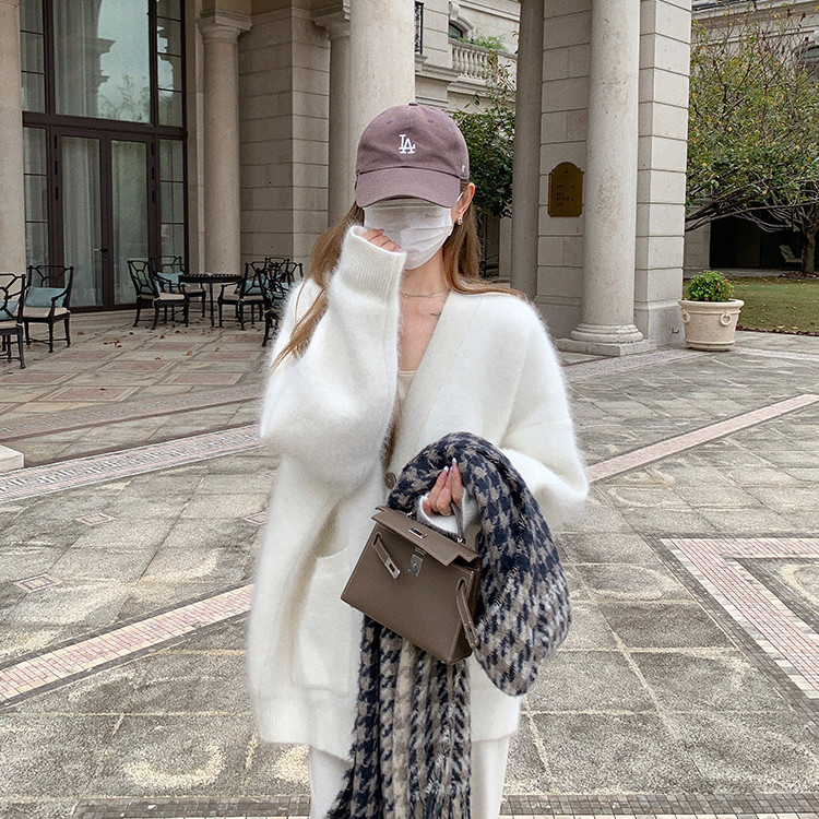 粉色v领水貂绒毛衣外套女秋冬温柔慵懒中长款外搭奶fufu针织开衫