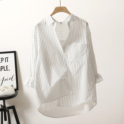 2025春季新款韩版白色条纹衬衫女宽松中长款简约防晒纯棉显瘦上衣