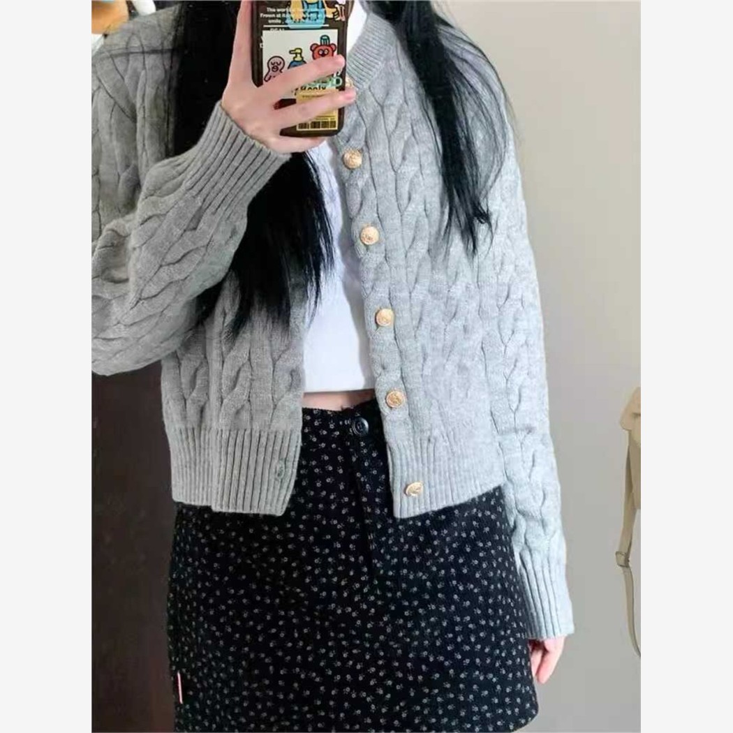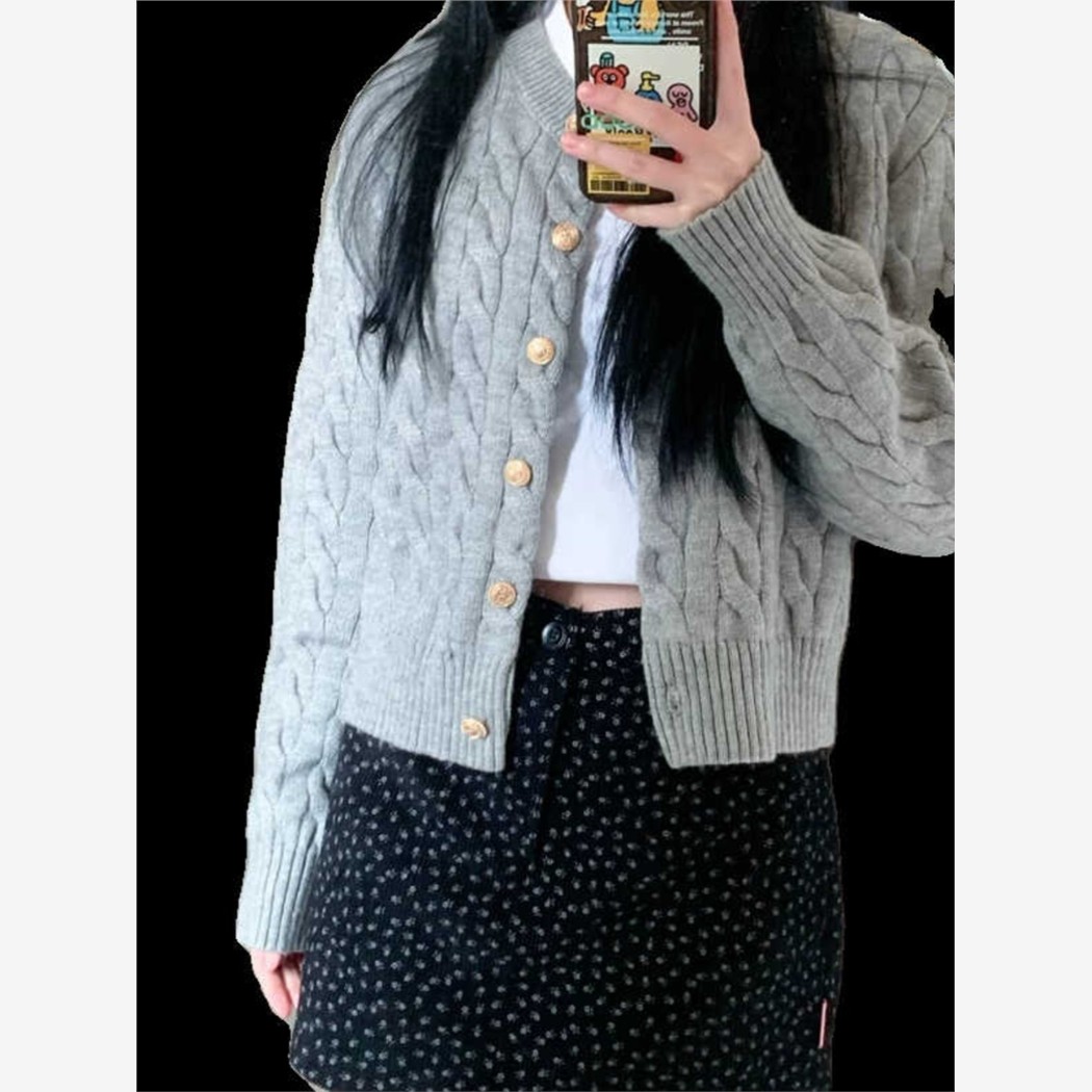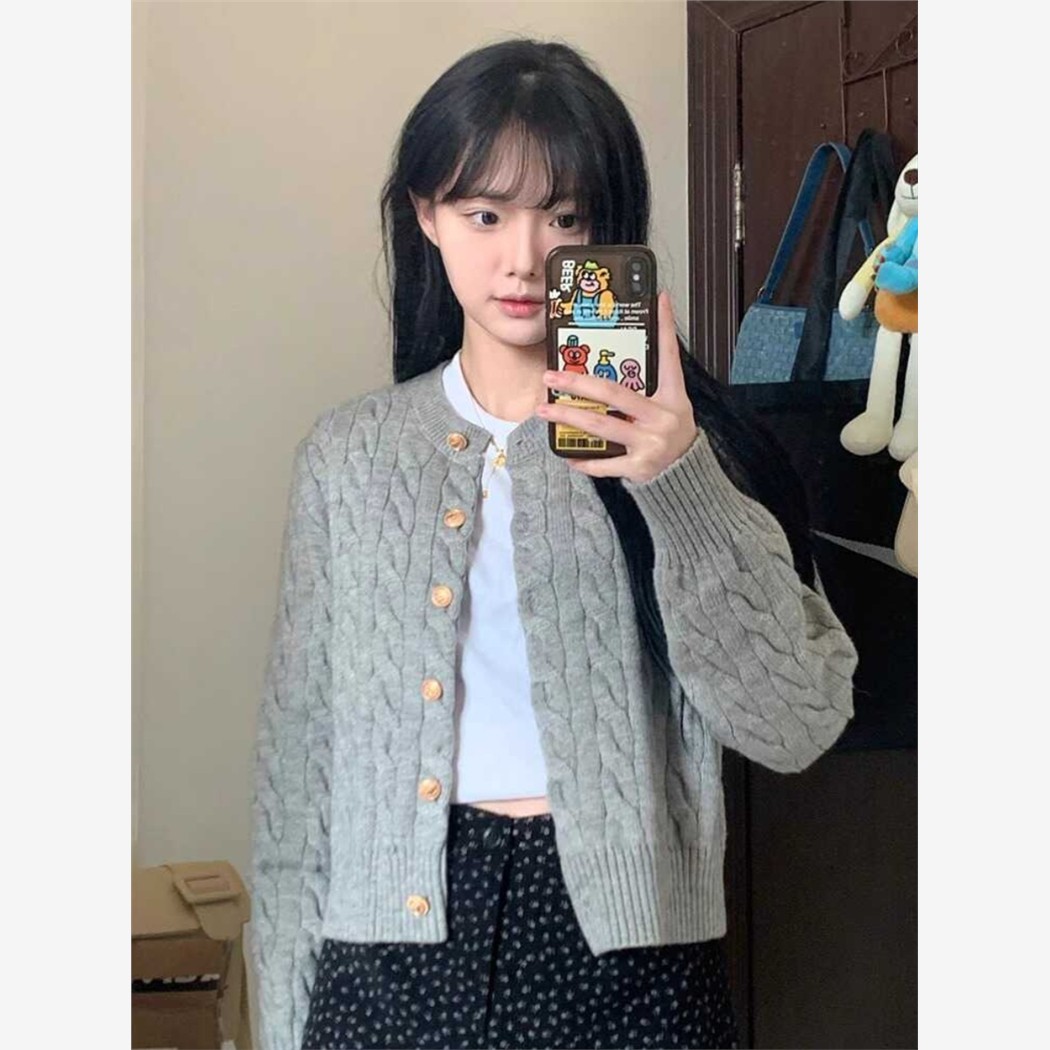 学院风百搭针织开衫女2025春秋冬新款小个子绞花上衣灰色毛衣外套
