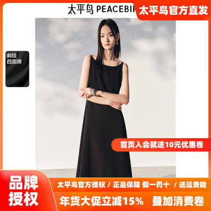 太平鸟小黑裙船领吊带连衣裙女2025秋新款防晒弹力简约长款黑