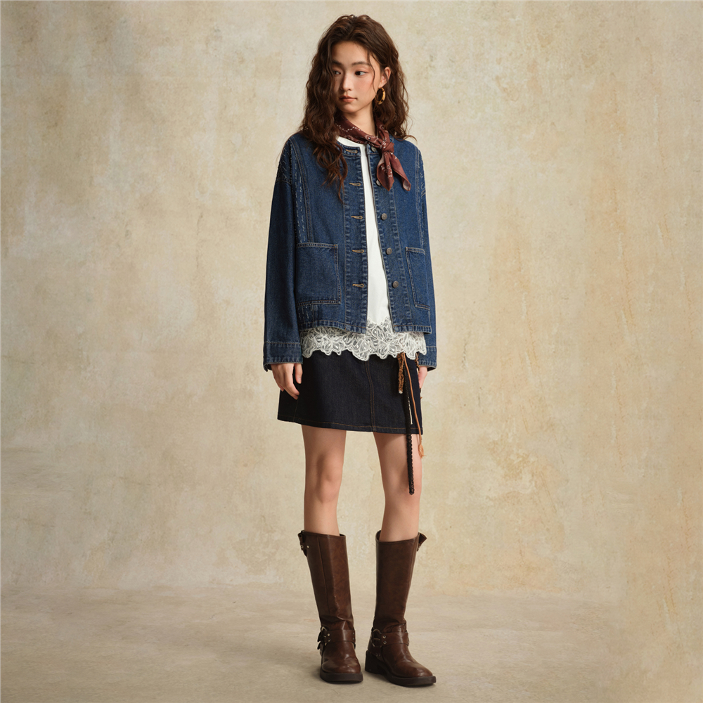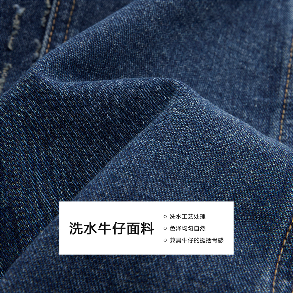 设计师款佐丹奴牛仔夹克女装磨破圆领双口袋宽松牛仔外套18375103