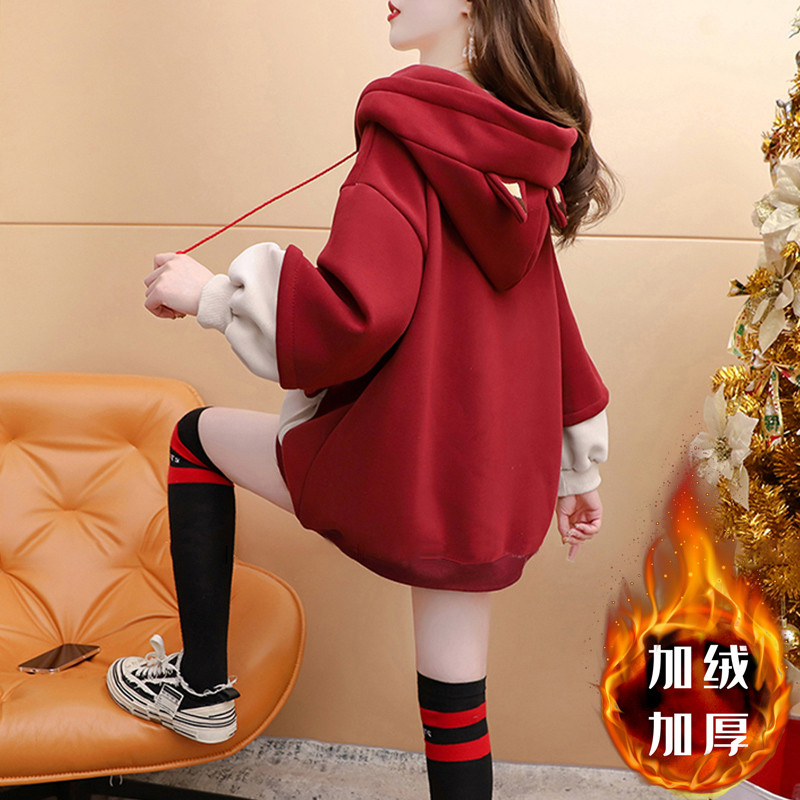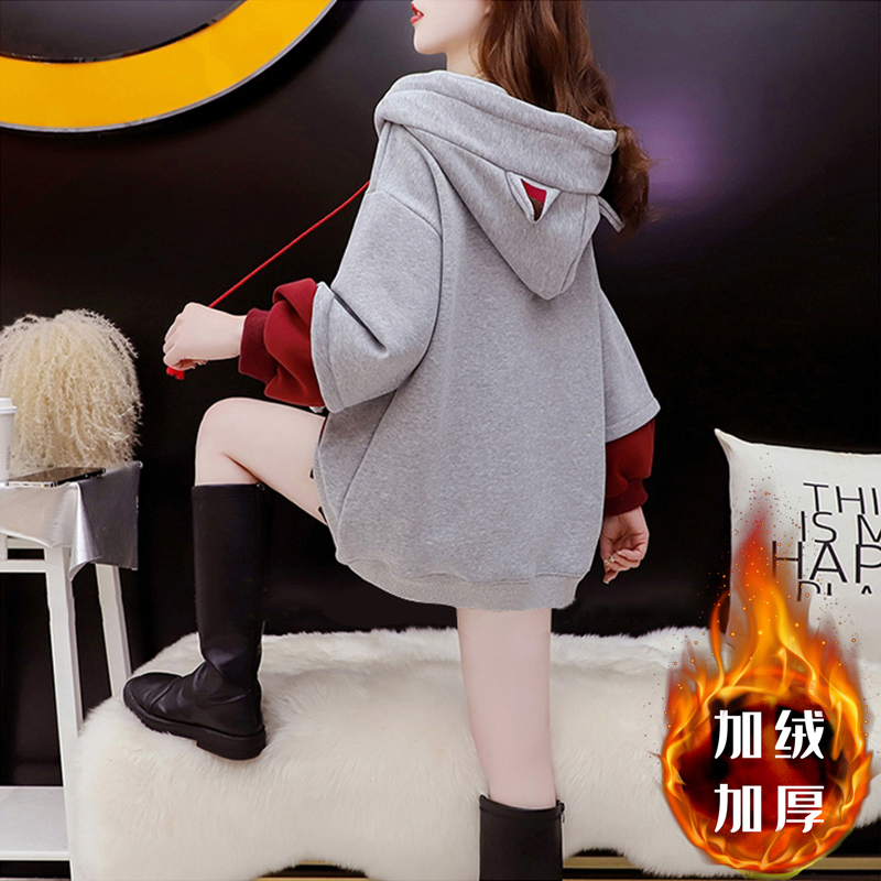 加绒加厚假两件连帽卫衣女秋冬款胖mm大码休闲百搭200斤带帽外套