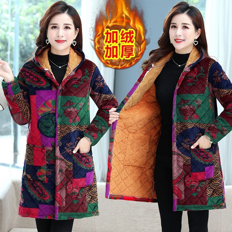 四川省服灯芯绒中长款棉衣女妈妈装加绒罩衣印花连帽防寒保暖棉袄