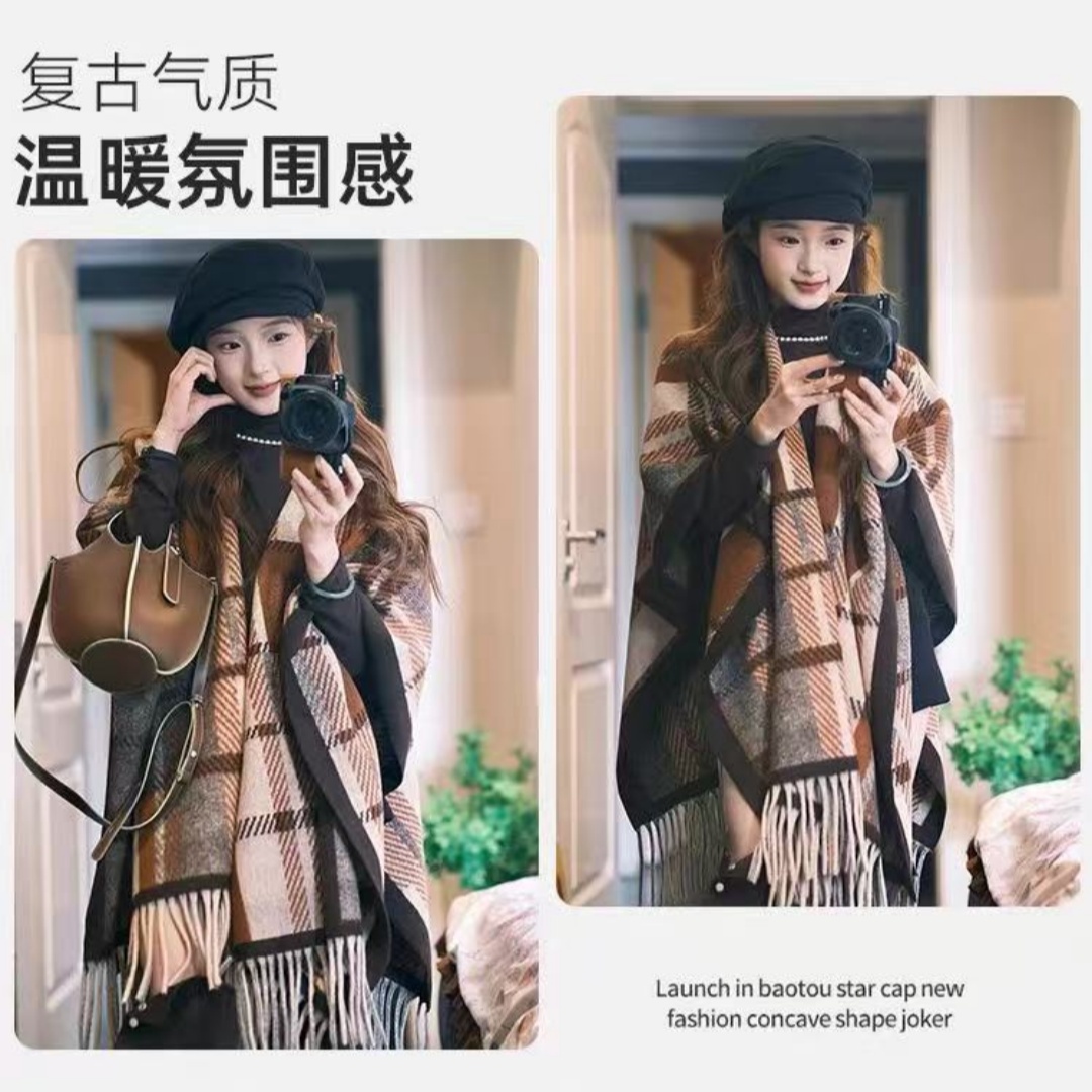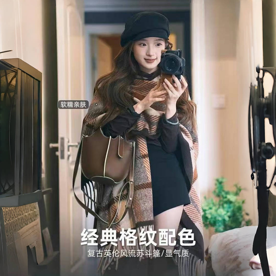 美拉德格子披肩女外搭2025新款百搭秋冬羊绒保暖围巾斗篷加厚披风