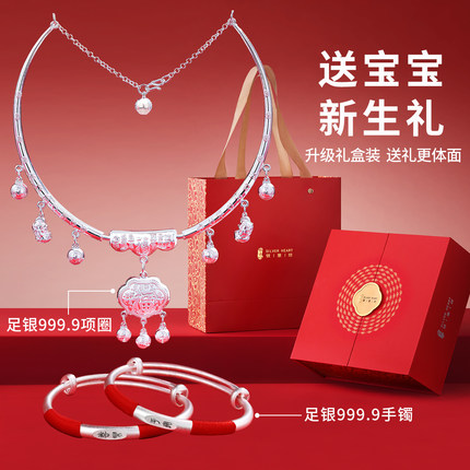 银锁宝宝纯银长命锁婴儿银项圈纯银9999小孩银手镯三件套满月礼物