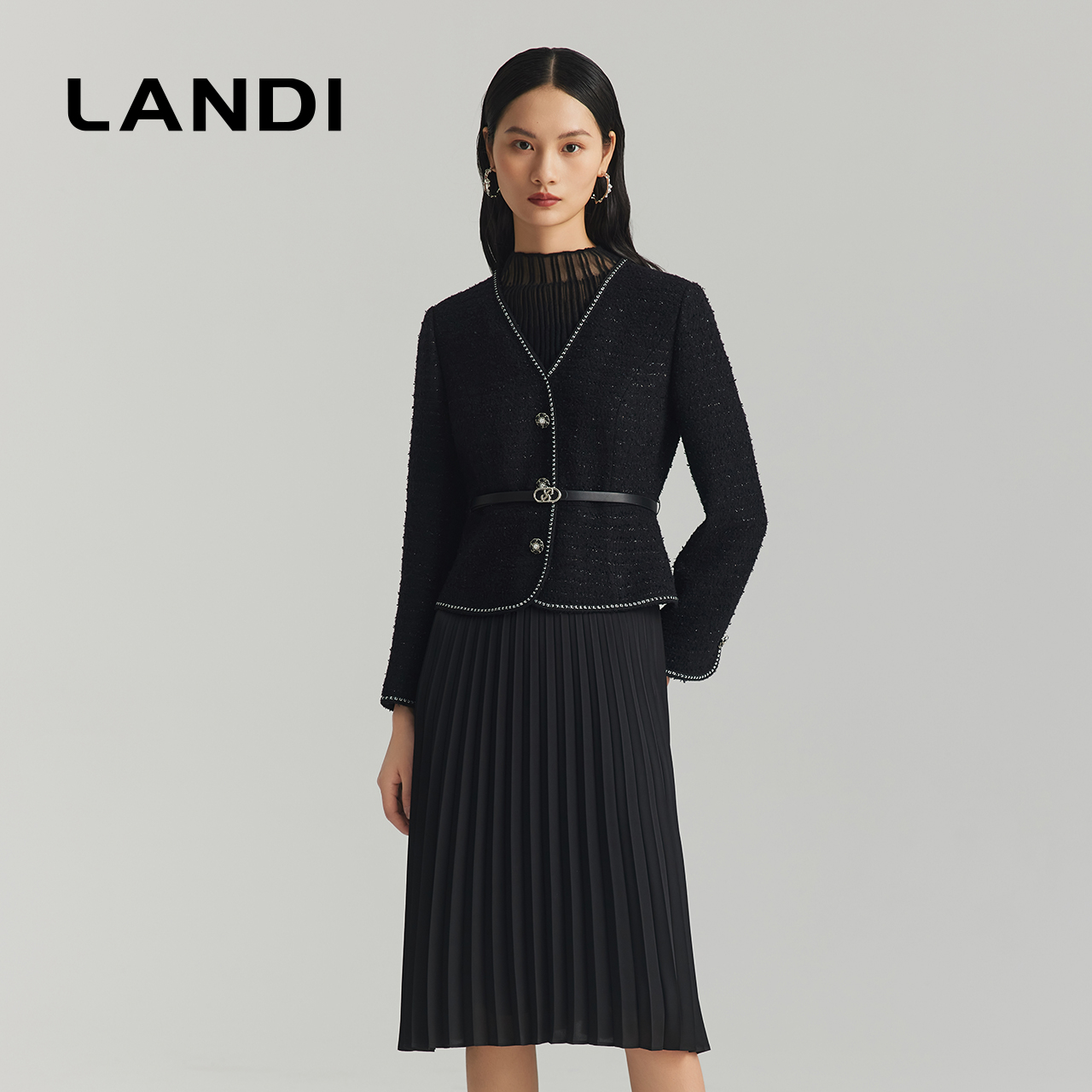 [商场同款]LANDI黑色绵羊毛假两件小香风拼接收腰连衣裙女冬新品