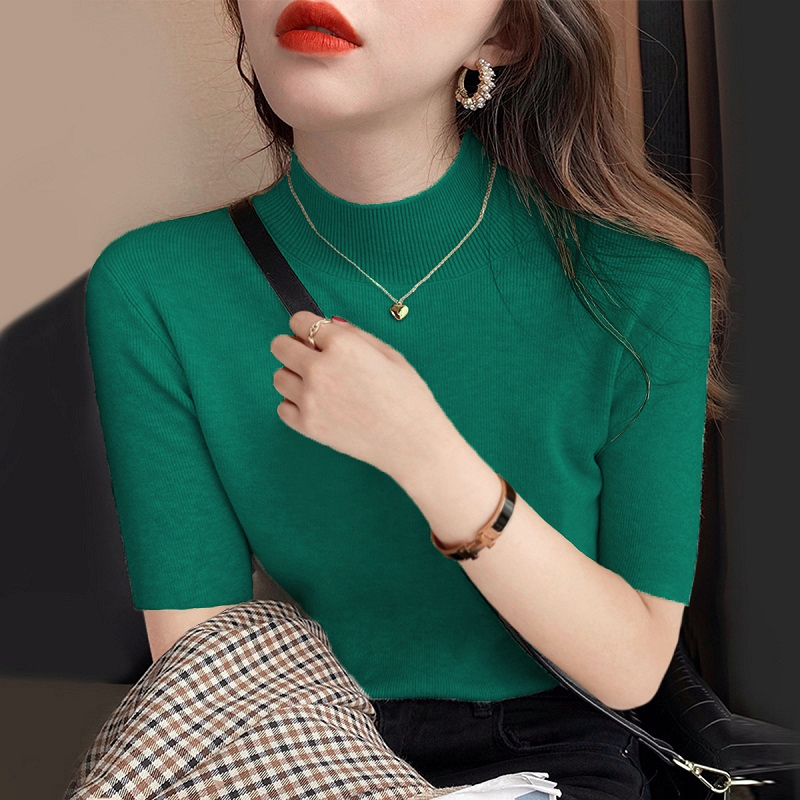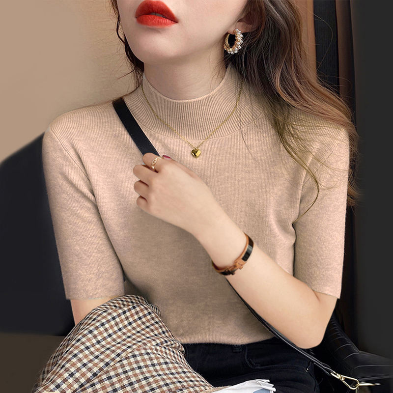 大码五分袖针织衫女春秋冬洋气半高领中袖t恤修身打底衫毛衣上衣