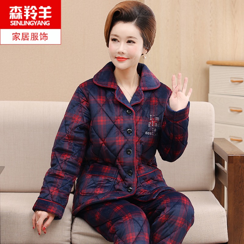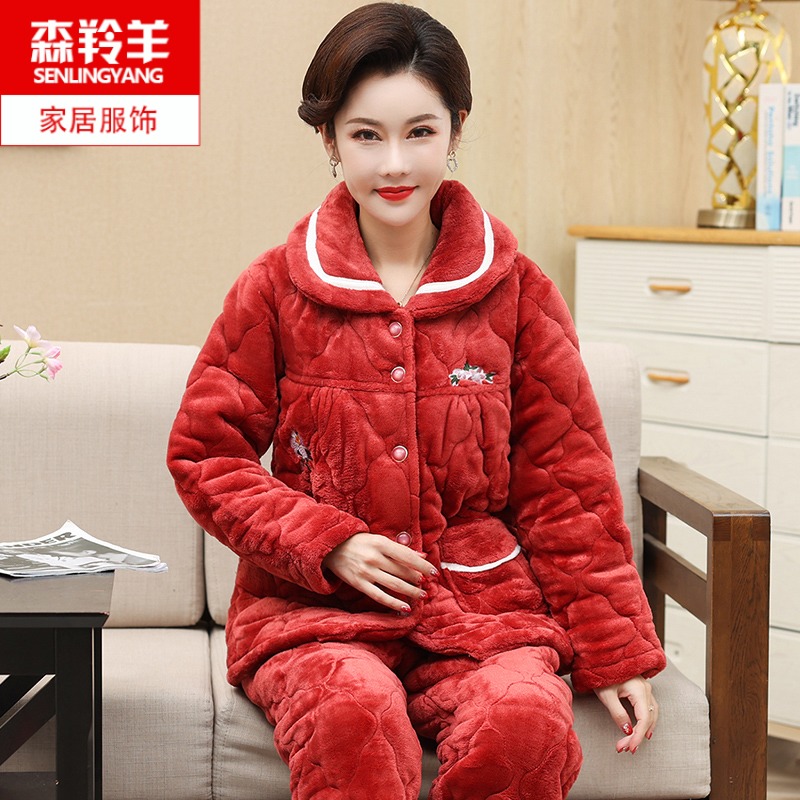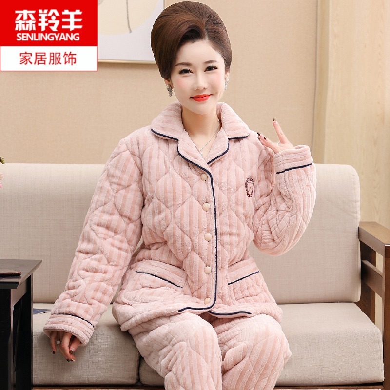冬季睡衣女士法兰绒家居服珊瑚绒三层夹棉加厚中老年人妈妈套装冬