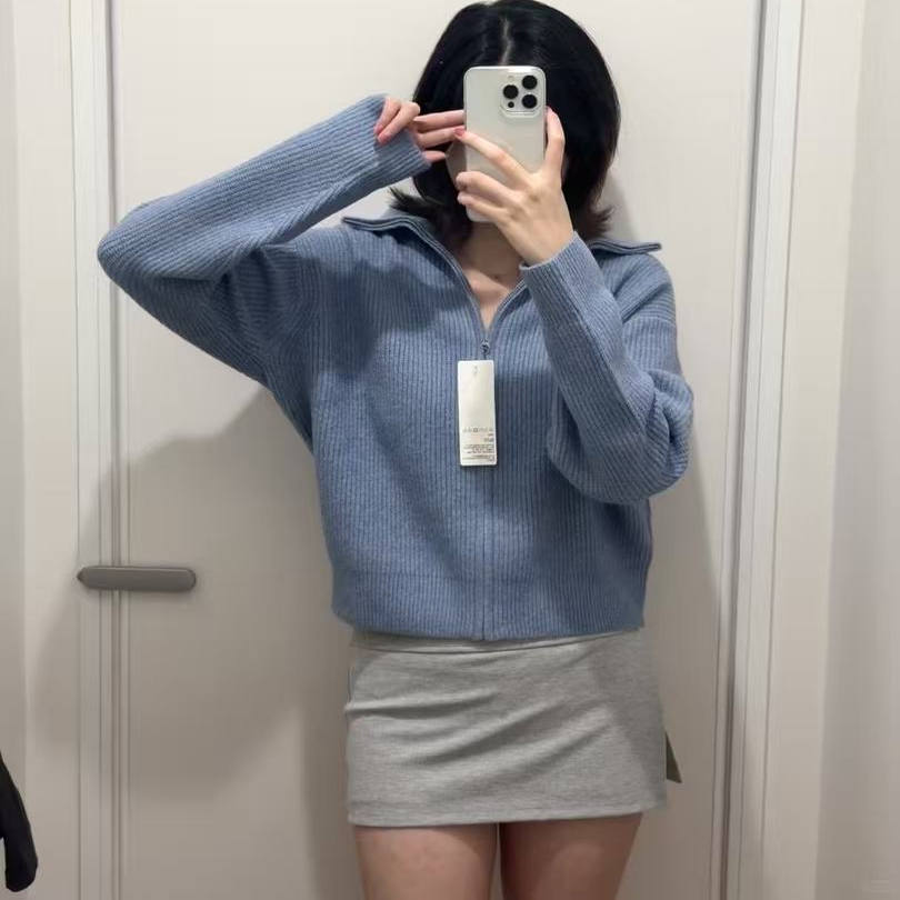 简约翻领蓝色套头毛衣女2025秋季新款慵懒宽松百搭拉链设计针织衫