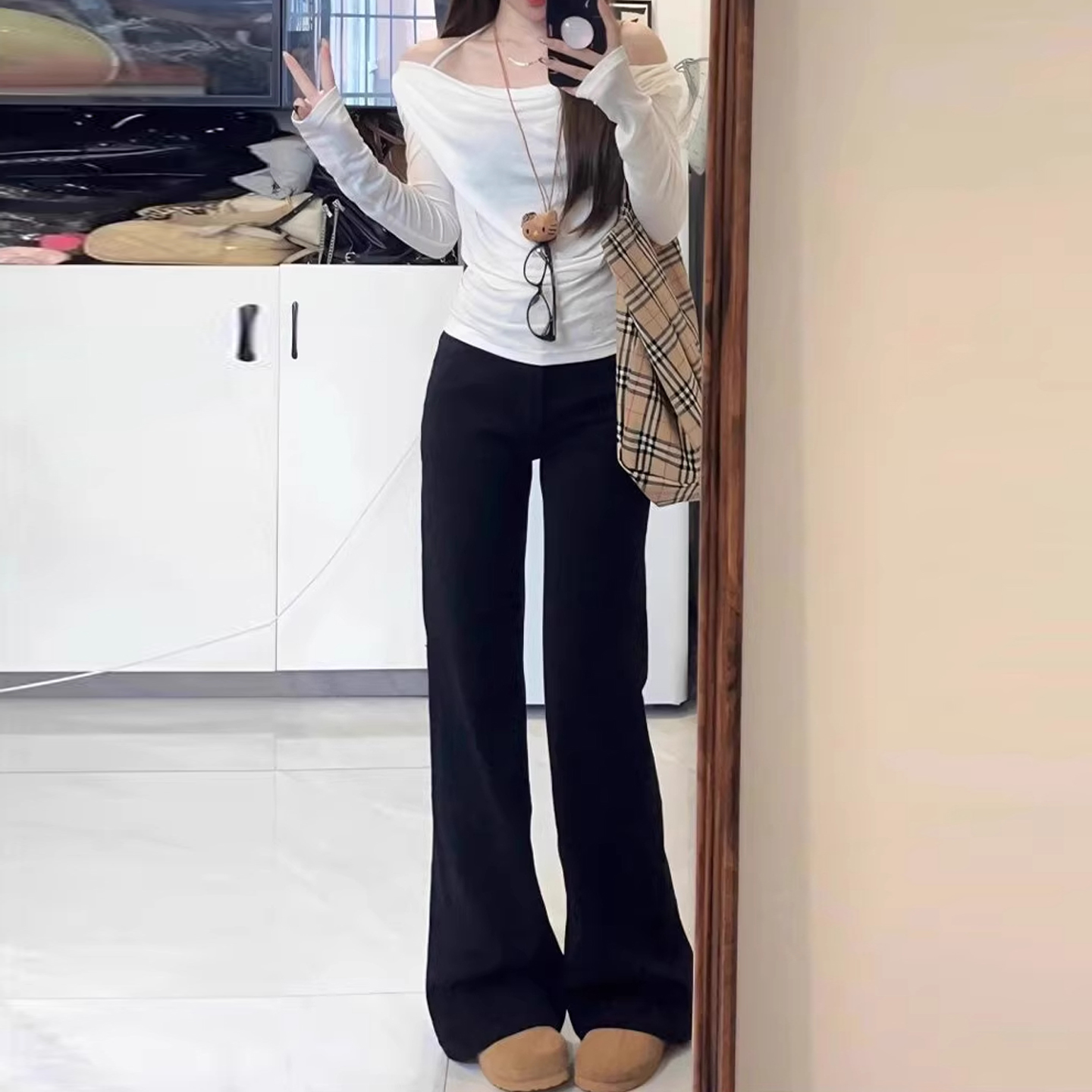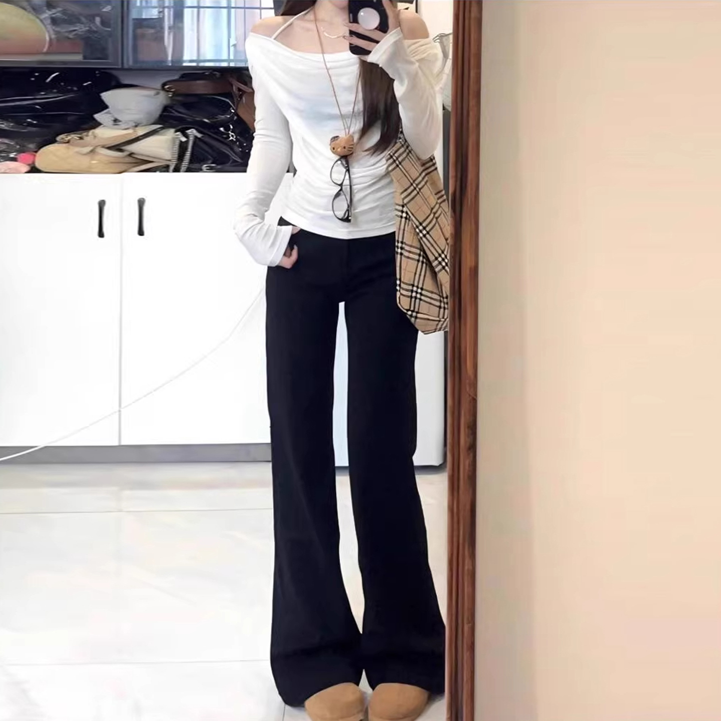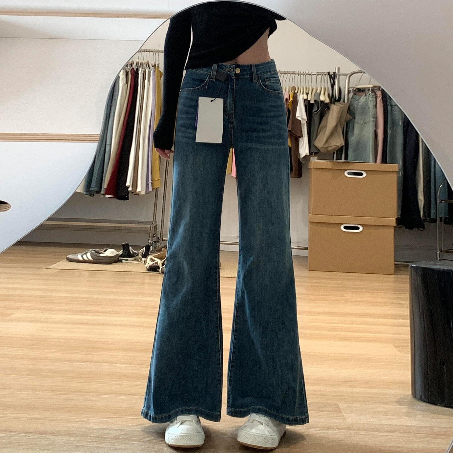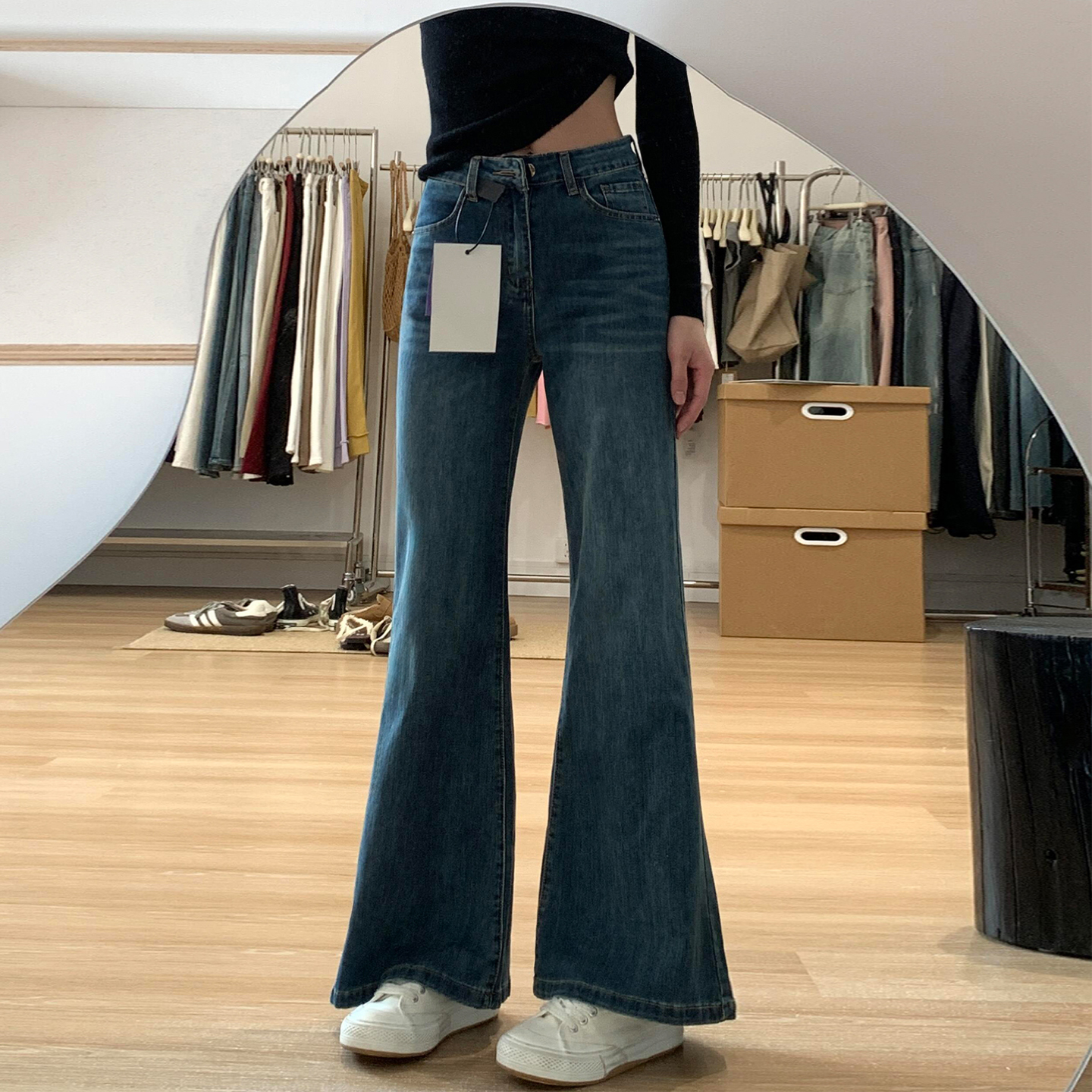 复古高腰微喇牛仔裤女秋新款胖妹妹mm显瘦弹力深蓝色不贴腿喇叭裤