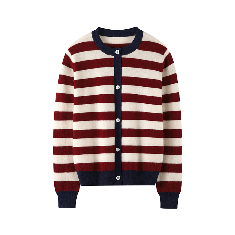 2025秋冬新款条纹减龄100%纯山羊绒开衫显瘦女毛衣外套圆领针织衫