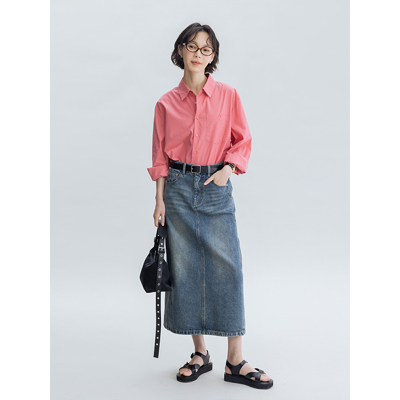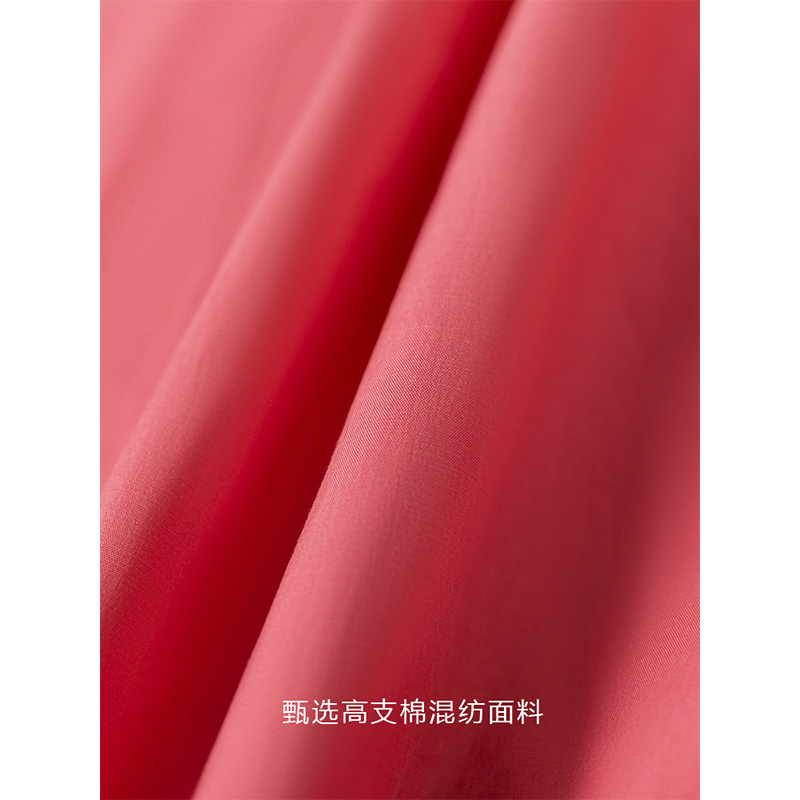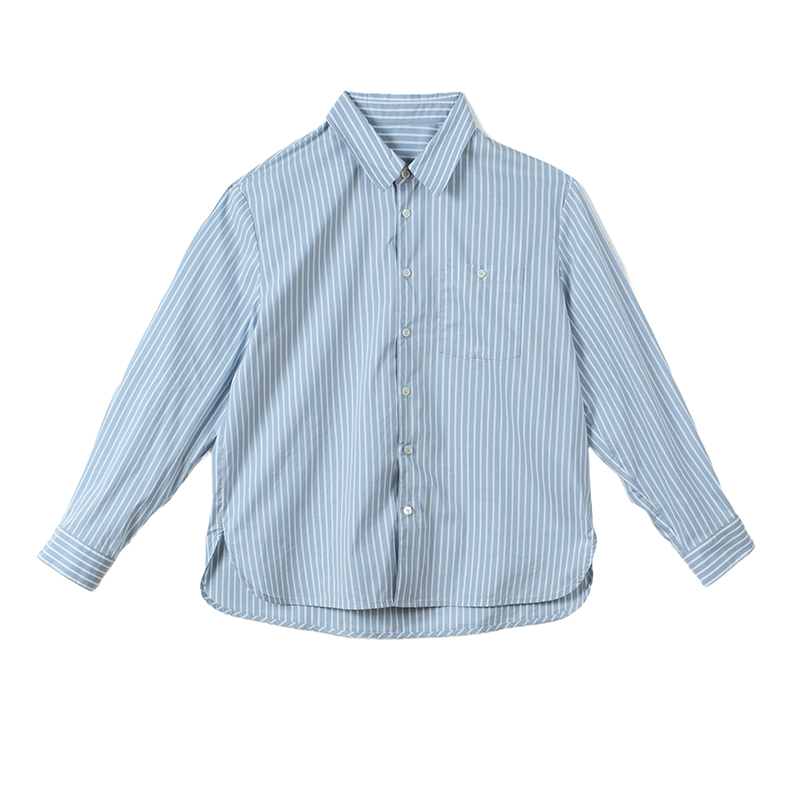 Dotdrobe多着 高支棉方领长袖衬衫女宽松落肩袖-蓝白条纹/桃粉