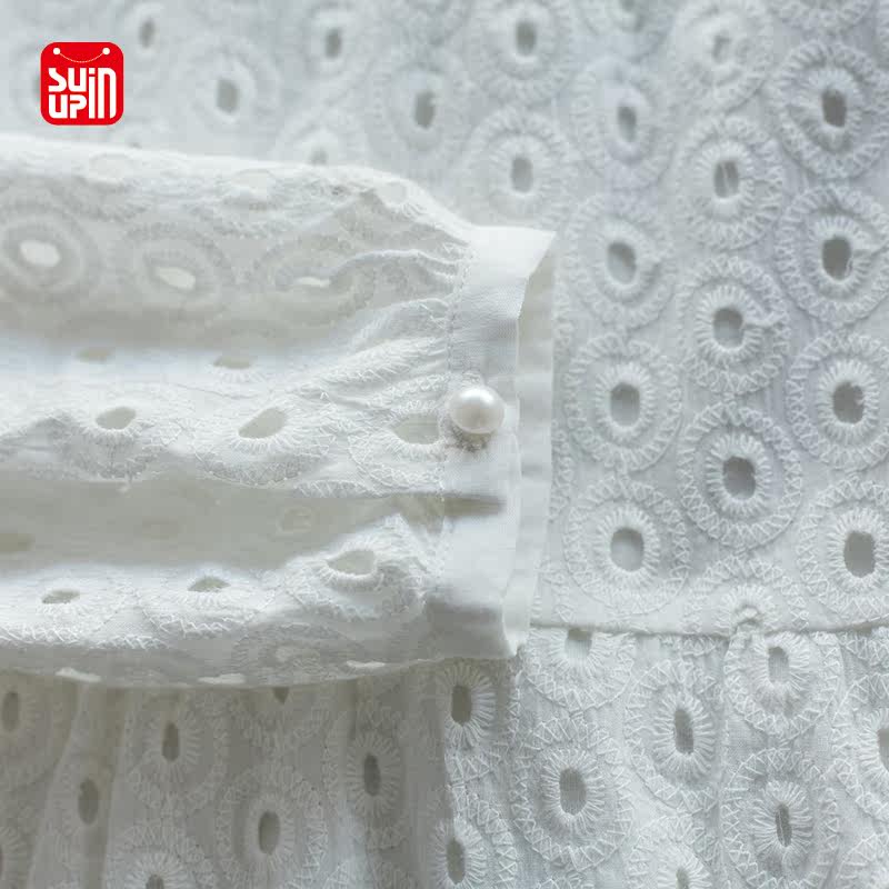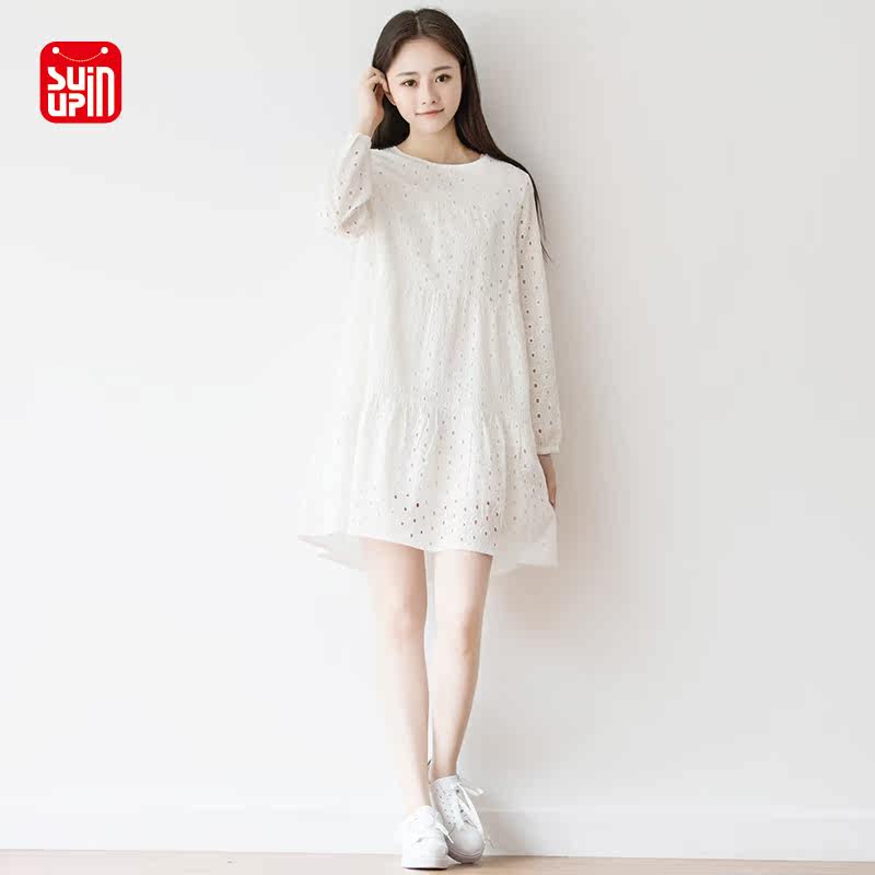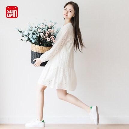SUIN优品2026新款文艺圆领纯棉绣花A字型长袖大摆中长款连衣裙