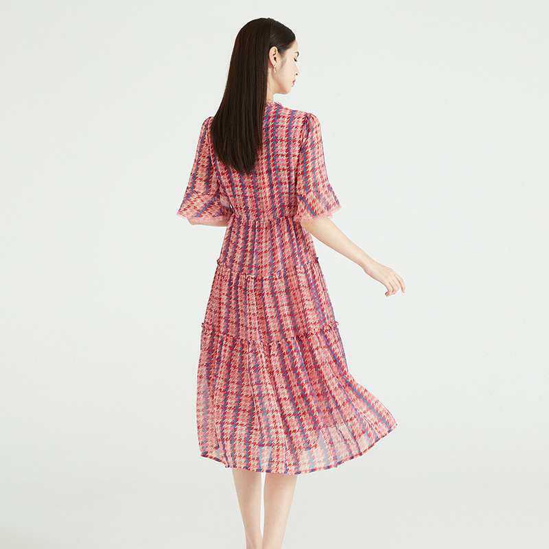 马天奴春秋女装粉色印花V领雪纺连衣裙子收腰喇叭袖法式气质时尚