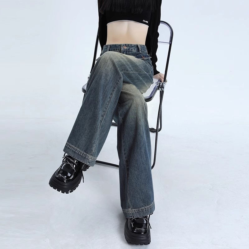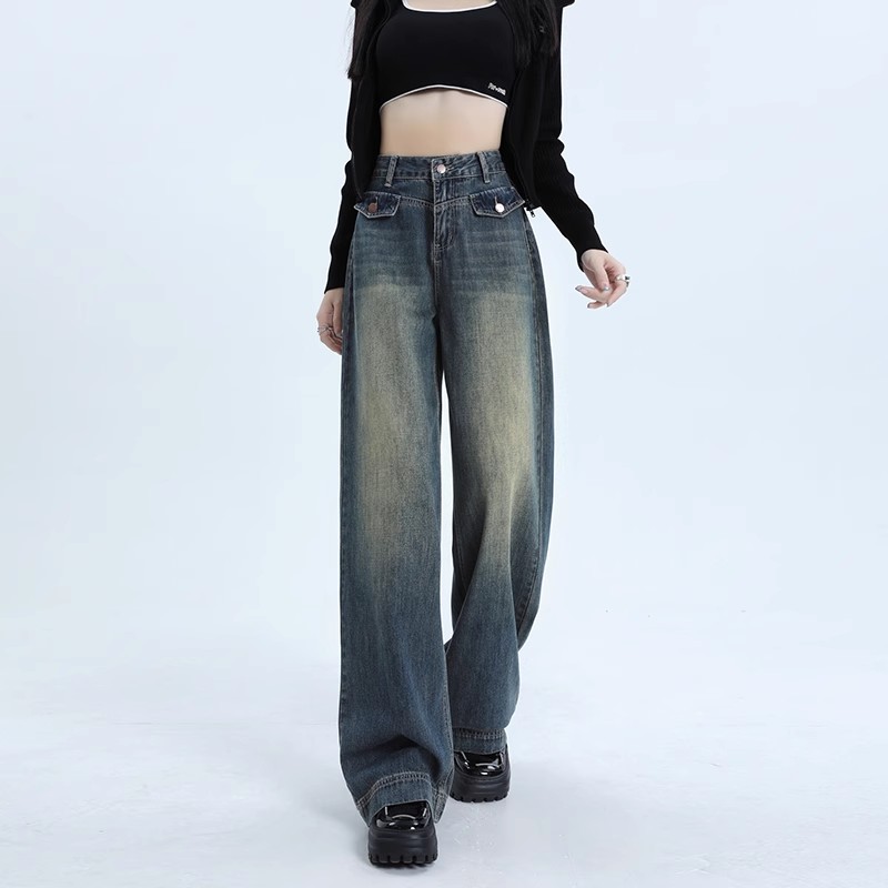 美式复古牛仔裤女显瘦垂感高腰宽松阔腿长裤春秋梨型身材裤子