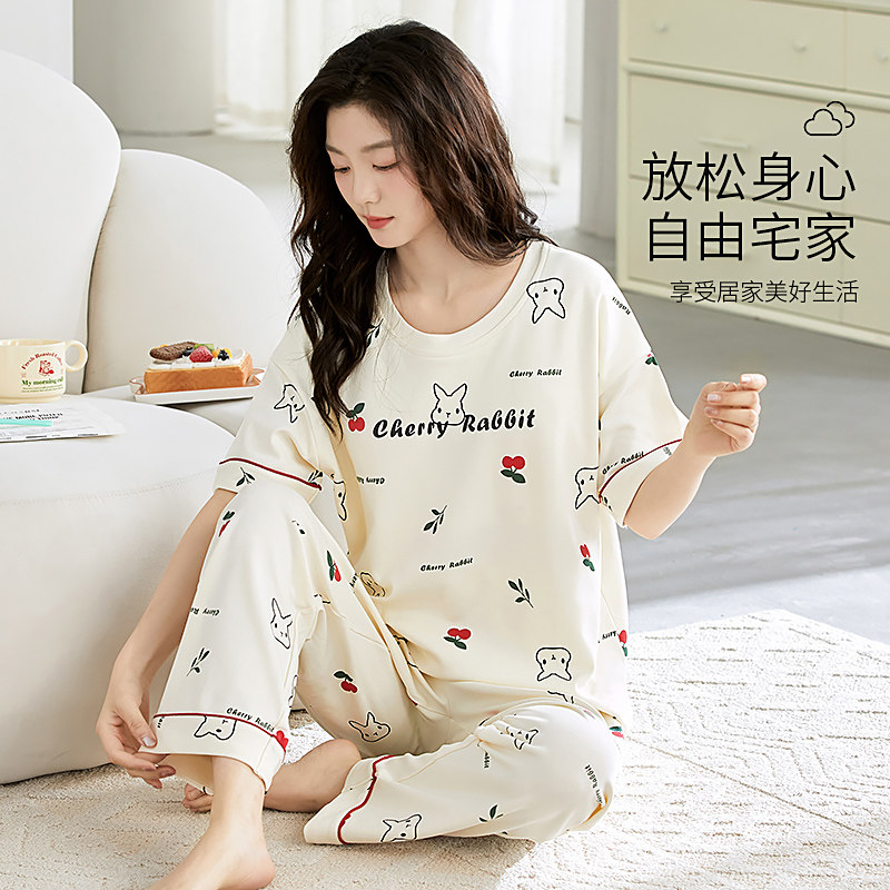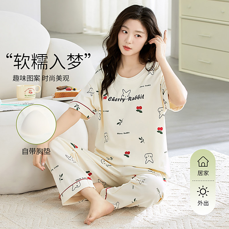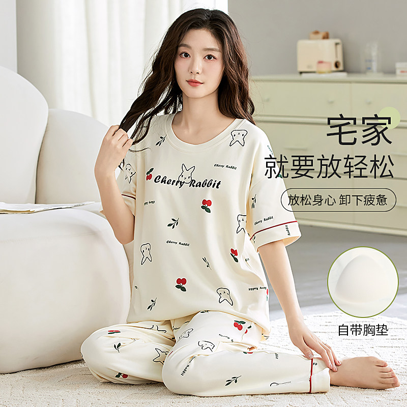 自带胸垫一体睡衣女春夏季短袖长裤可外穿套装韩版夏天宽松家居服