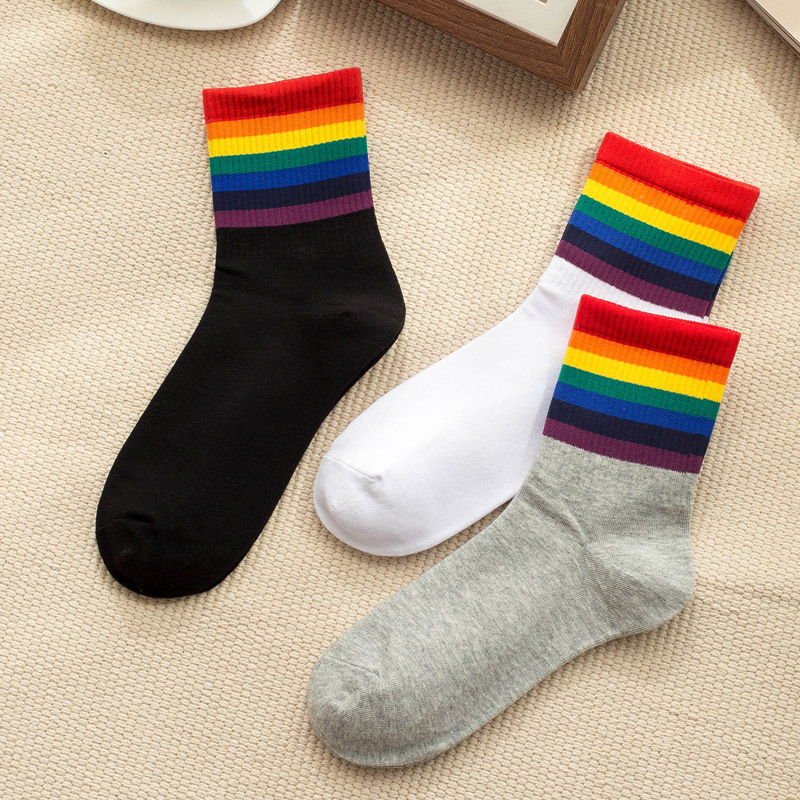 彩虹袜子女中筒袜黑色白色夏运动潮ins韩国糖果色条纹袜春秋纯棉