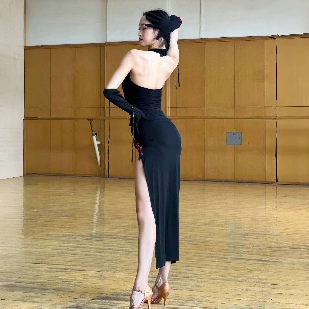 2025新款拉丁舞服女黑色玫瑰挂脖上衣半裙练功服练舞表演显瘦款